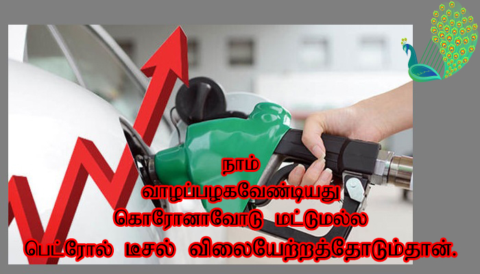 சென்னையில் தொடர்ந்து 16வது நாளாக பெட்ரோல், டீசல் அதிகரித்து வருகிறது. இதனால் வாகன ஒட்டிகள் பெரும் கவலைக்கு ஆளாகியுள்ளனர். 08,ஆனி,தமிழ்த்தொடராண்டு-5122: நமது அன்றாட தேவைகளில் ஒன்றாக பெட்ரோல், டீசல் உள்ளிட்ட எரிபொருட்கள் மாறிவிட்டன. ஒருவர் மீது ஒருவர் சாய்ந்து ஓடம் போல ஆடலாம் பாடலாம் என்று தன்னினைவு இல்லாமல் ஆடுவர்கள் கதைத் தலைவன் எம்ஜியாரும், மஞ்சுளாவும் நினைத்ததை முடிப்பவன் படத்தில். நடுவண் அரசும், எண்ணெய் நிறுவனங்களும் இங்கே இந்தியாவில் மதிமயங்கி வரியை உயர்த்திக் கொண்டும், விலையை உயர்த்திக் கொண்டும் ஒருவர் மீது ஒருவர் சார்ந்து உற்சாகமாக ஆடிக் கொண்டிருக்கிறார்கள். மாதத்திற்கு ஒருமுறை இருமுறை என்று விலை நிர்ணய முறை சுமார் 15 ஆண்டுகளாக நடைமுறையில் இருந்து வந்தது. பாஜக ஆட்சியில் நாள்தோறும் பெட்ரோல், டீசல் விலை நிர்ணயம் செய்யும் முறை நடைமுறைக்கு வந்தது. இதன் பொறுப்பு எண்ணெய் நிறுவனங்களின் கையில் ஒப்படைக்கப்பட்டது. இந்த முறையில் பெட்ரோல், டீசல் அதிரடியான மாற்றங்களை கண்டு வருகிறது. இதனால் பெரும்பாலும் பொதுமக்கள் சிரமத்திற்கு ஆளாக நேரிடுகிறது. பெட்ரோல் டீசல் விலையானது சிறிதளவில் இறக்கம் ஏற்பட்டு அதிரடியாக ஏற்றம் கண்டுவருவதை காண முடிகிறது. இந்நிலையில் சென்னையில் இன்றைய பெட்ரோல் விலை நேற்றைய விலையில் இருந்து 29 காசுகள் உயர்ந்து லிட்டருக்கு ரூ.82.87ஆக விற்கப்படுகிறது. இதேபோல் டீசல் விலை 50 காசுகள் அதிகரித்து லிட்டருக்கு ரூ.76.30 என்ற விலையில் விற்கப்பட்டு வருகிறது. இந்த விலை இன்று காலை 6 மணி முதல் அமலுக்கு வந்துள்ளது. சென்னையில் தொடர்ந்து 16வது நாளாக பெட்ரோல், டீசல் அதிகரித்து வருகிறது. இதனால் வாகன ஒட்டிகள் பெரும் கவலைக்கு ஆளாகியுள்ளனர். இப்போதைக்கு இந்தப் பாடலை கொரோனாவுடன் நாமும் பாடி, கொரோனாவுடன் மட்டுமல்லாமல் விலையேற்றங்களோடும் வாழப் பழகுவோம். ஒருவர் மீது ஒருவர் சாய்ந்து ஒருவர் மீது ஒருவர் சாய்ந்து சொட்டுத் தேனைப்போல் சொல்லும் வார்த்தைகள் சொல்லித் தாருங்கள் ...பள்ளிப் பாடங்கள் கட்டுக்காவல்கள் விட்டுச் செல்லட்டும்