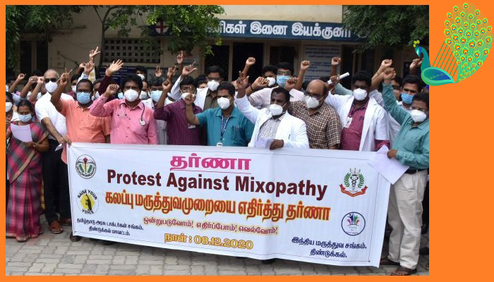 தமிழகத்தில் ஆங்காங்கே, தமிழ்நாடு அரசு மருத்துவர்கள் சங்கம், இந்திய மருத்துவர் சங்கம் மற்றும் பல் மருத்துவர் சங்கம் சார்பில் ஆர்ப்பாட்டங்கள் நடந்தன. 24,கார்த்திகை,தமிழ்த்தொடராண்டு-5122: அரசு மருத்துவமனைகள் முன்பு தமிழ்நாடு அரசு மருத்துவர்கள் சங்கம், இந்திய மருத்துவர் சங்கம் மற்றும் பல் மருத்துவர் சங்கம் சார்பில் ஆர்ப்பாட்டங்கள் நடந்தன. இந்திய மருத்துவ சங்க திண்டுக்கல் தலைவர் கோடீஸ், செயலாளர் வெங்கடேசன், பொருளாளர் ராமச்சந்திரன் மற்றும் டாக்டர் நாகராஜன், பல் மருத்துவ சங்க செயலாளர் ஆனந்த் யோகேஷ், அரசு மருத்துவர்கள் சங்கத்தைச் சேர்ந்த சேக் மற்றும் மருத்துவர் சுரேஷ் பாபு உட்பட பலர் பங்கேற்றனர். பாஜக ஆட்சிப் பொறுப்பு ஏற்றதில் இருந்து- ஆர்எஸ்எஸ்சின் வேதாந்தக் கொள்கைகளின் முதன்மை அடையாளங்களைத் தலைமைப் படுத்தி- ஒரேநாடு ஒரே ஆதார், ஒரேநாடு ஒரே சரக்கு சேவை வரி, ஒரேநாடு ஒரே ஹிந்திமொழி, ஒரேநாடு ஒரே ஹிந்துத்துவா மதம் என்றெல்லாம் பல சட்டமுன்வரைவுகளை அரங்கேற்றி வருகிறது. அந்த வகையில் ஆயுர்வேதா மருத்துவமுறைக்கு சிறப்பு அங்கீகாரம் வழங்கும் முகமாக அதில் மேற்படிப்பைத் தொடங்குகிறது. அந்த மேற்படிப்பில் ஒரேநாடு ஒரே மருத்துவ முறை என்று அல்லோபதியின் அறுவை சிகிச்சை உள்ளிட்டவற்றை ஆயுர்வேதா மேற்படிப்பில் பயிற்றுவிக்க முனைந்திருக்கிறது. சித்தா, ஆயுர்வேத, யோகா மற்றும் யுனானி படிப்புக்கு ஒன்றிய அரசின் அனுமதி வழங்கப்பட்டு நடைமுறையில் உள்ளது. இந்த நிலையில் பாஜக மேற்படிப்பில் அதனை நவீன அலோபதி மருத்துவ முறையில் கற்பது மற்றும் பயிற்சி அளிப்பது என்கிற நிலையை முன்னெடுத்து வருகிறது. இது ஏற்க கூடியது அல்ல. உலகில் எந்த நாட்டிலும் இது போன்ற கலப்பு மருத்துவப் படிப்பு கிடையாது. ஒன்றிய பாஜக அரசின் இச்செயல்பாட்டை ஏற்க முடியாது. எனவே, இதற்கு எதிர்ப்பு தெரிவிப்பதாக நடப்பு அல்லோபதி மருத்துவத்தில் பட்டம் பெற்ற மருத்துவர்கள் தெரிவித்தனர். தமிழகத்தில் ஆங்காங்கே அரசு மருத்துவமனை எதிரில் இந்திய மருந்துவ சங்கம் சார்பில் ஆர்ப்பாட்டம் நடந்தது. இதில் இந்திய பல்மருத்துவர்கள் சங்கத்தினர், தமிழ்நாடு அரசு மருத்துவர்கள் சங்கத்தை சேர்ந்த பலர் பங்கேற்று வருகின்றனர். இந்த வகைப் போராட்டம் விருதுநகர் மாவட்ட ஆட்சியர் அலுவலக வளாகத்தில் இந்திய மருத்துவ சங்கத்தின் சார்பில் நடைபெற்றது. இந்த ஆர்ப்பாட்டத்திற்கு ராஜபாளையம் கிளைத் தலைவர் ஜவகர்லால் தலைமை வகித்தார். ஒன்றிய பாஜக அரசு தற்போது கொண்டு வந்துள்ள ஆயுர்வேத மருத்துவர்களும் நவீன அறிவியல் அறுவை சிகிச்சைகளை, பயிற்சி எடுத்துக் கொண்டு செய்யலாம் என்ற வழிகாட்டுதலை கண்டித்தும், இந்தி