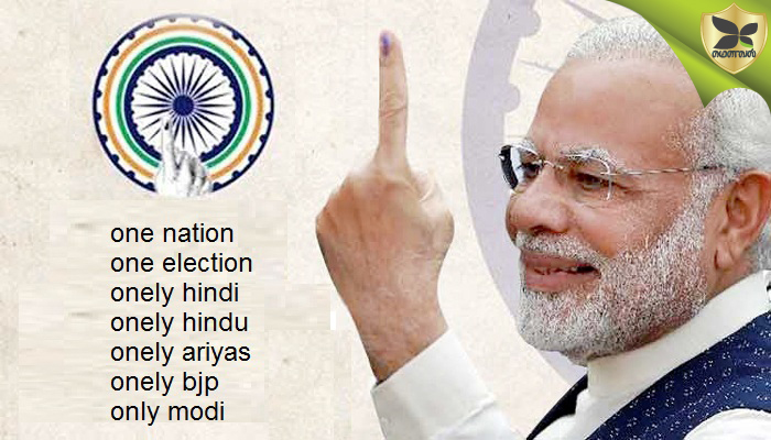 மோடி பாஜக அரசின், மாநில உரிமைகள் பறிக்கும் நடவடிக்கைகளின் அடுத்த மைல்கல்லே, ஒரேதேசம், ஒரேதேர்தல்! 05,ஆனி,தமிழ்தொடர்ஆண்டு-5121: நீட் மூலமாக மாநில அரசுகளின் மருத்துவக் கல்வி உரிமை, சரக்கு-சேவை வரி மூலமாக மாநில அரசுகளின் வரி வாங்கும் உரிமை, ஆதார் மூலமாக மாநில அரசுகளின் குடும்ப அட்டை மீது அதிகாரம். ஒன்று விடாமல் மாநில அரசுகளின் அனைத்து உரிமைகளையும் பறிப்பதற்கு, மோடி அரசின் நிறைய மசோதாக்கள் நிலுவையில் உள்ளன. அவைகள் எல்லாம் முற்றாக நிறைவேற்றப்படும் போது, மாநில அரசுகளுக்கு ஊராட்சி கிராமப் பஞ்சாயத்துகளுக்கு இருக்கிற உரிமை கூட இருக்காது. தற்போது நடுவண் பாஜக அரசு கையில் எடுத்திருக்கும் மாநில உரிமை பறிப்பு: ஒரேதேசம், ஒரேதேர்தல். ஒரேதேசம், ஒரேதேர்தல் குறித்து ஆலோசனைகளை பெறுவதற்காக குழு அமைக்கப்படும் என்று மாநில உரிமைகள் குறித்து கவலை கொள்ளாத கட்சிகள் கூட்டத்தில் பிரதமர் மோடி தெரிவித்துள்ளார். இந்தக் கூட்டமானது நேற்று பிற்பகல் சுமார் 3.30 மணியளவில் தொடங்கியது. இந்த கூட்டத்தில் பாஜக கூட்டணியில் அங்கம் வகிக்கும் அதிமுக பங்கேற்கவில்லை. அதிமுக சார்பில் இந்த கூட்டத்தில் பங்கேற்பதற்காக அமைச்சர் சி.வி. சண்முகம் தில்லி சென்றிருந்தார். எனினும், அவர் இந்த கூட்டத்தில் பங்கேற்கவில்லை. இந்த நிலையில், இந்த கூட்டமானது சுமார் மூன்றரை மணி நேரத்துக்குப் பிறகு நிறைவடைந்தது. இதையடுத்து, நடுவண் பாதுகாப்புத் துறை அமைச்சர் ராஜ்நாத் சிங் தில்லியில் இந்த கூட்டம் குறித்து விளக்கம் அளிக்கையில், 40 கட்சிகளுக்கு அழைப்பு விடுத்த நிலையில், 21 கட்சிகளின் தலைவர்கள் மட்டுமே இந்த கூட்டத்தில் பங்கேற்றனர். பல்வேறு காரணங்களுக்காக இந்த கூட்டத்தில் பங்கேற்க முடியவில்லை என்று அவர்கள் தெரிவித்தனர். 3 கட்சிகள் தங்களது கருத்துகளை எழுத்துப்பூர்வமாக பதிவிட்டனர். ஒரேதேசம், ஒரே தேர்தலுக்கு பெரும்பாலான கட்சிகள் தங்களது ஆதரவை தெரிவித்துள்ளனர். மார்க்சிஸ்ட் கம்யூனிஸ்ட் மற்றும் இந்திய கம்யூனிஸ்ட் கட்சிகளுக்கு இதில் மாற்றுக் கருத்து உள்ளது. ஆனால், இந்த சிந்தனையை அவர்கள் எதிர்க்கவில்லை. இதை செயல்படுத்தும் விதத்தை தான் அவர்கள் எதிர்க்கின்றனர். ஒரேதேசம், ஒரேதேர்தல் விவகாரம் குறித்து குறிப்பிட்ட காலவரையறைக்குள் பரிந்துரை மற்றும் ஆலோசனைகளை பெறுவதற்காக ஒரு குழு அமைக்கப்படும் என்று தலைமைஅமைச்சர் மோடி தனது உரையில் தெரிவித்தார் என்றார். மாநில உரிமைகள் குறித்த முழக்கத்தை தமிழகம் மட்டுமே இந்திய விடுதலைக்கு முன்பிருந்தே முழங்கி வருகிறது. ஆனால், கண்ணை திறந்து கொண்டே, செயலலிதாவிற்கு பிந்தைய அதிமுகவால் இரண்டு தலையாயத்துவமான உரிமைகளான மருத்துவக