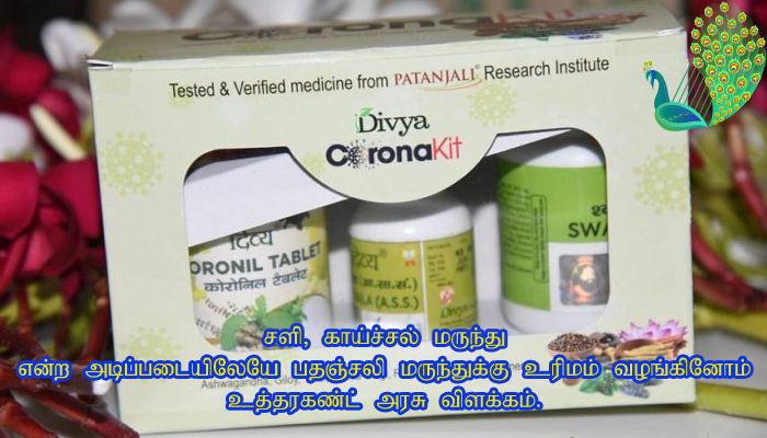 பதஞ்சலி நிறுவனத்தின் கொரோனா நுண்நச்சு மருந்துகளை விற்க ஆயுஷ் அமைச்சகம் தடை. சளி, காய்ச்சல் மருந்து என்ற அடிப்படையிலேயே பதஞ்சலி மருந்துக்கு உரிமம் வழங்கினோம் உத்தரகண்ட் அரசு விளக்கம். 10,ஆனி,தமிழ்த்தொடராண்டு-5122: பதஞ்சலி நிறுவனம் நேற்று கொரோனில் எனும் பெயரில், கொரோனா நோய்த் தொற்றுக்கான ஆயுர்வேத மருந்து கண்டுபிடித்து விட்டதாக அறிவித்து, வெளியிடவும் செய்தது. இந்நிலையில், கொரோனா தொற்றுக்கு சிகிச்சையளிக்கக்கூடிய பதஞ்சலி நிறுவனத்தால் தயாரிக்கப்பட்ட ஆயுர்வேத மருந்து குறித்த ஊடக செய்தி தங்களின் கவனத்திற்கு வந்துள்ளதாகவும், மருந்து குறித்த விவரங்கள் நிறுவனத்திடம் கோரப்பட்டுள்ளதாகவும், அதுவரை இந்த மருந்து குறித்த விளம்பரத்தை நிறுத்துமாறு கேட்டுக் கொள்ளப்பட்டுள்ளதாகவும் ஆயுஷ் அமைச்சகம் தெரிவித்துள்ளது. தங்கள் மருந்து தொடர்பான அனைத்து தகவல்களையும் ஆயுஷ் அமைச்சகத்துக்கு அளித்துள்ளதாகவும், தகவல் தொடர்பு இடைவெளி தற்போது நிரப்பப்பட்டுள்ளதாகவும் பதஞ்சலி நிறுவனத்தின் தலைமை செயல் அதிகாரி ஆச்சார்ய பாலகிருஷ்ணா கீச்சுவில் தெரிவித்துள்ளார். ஆயுர்வேத மருத்துவத்துக்கு ஊக்கத்தையும் பெருமையையும் இந்த அரசு வழங்கியுள்ளது என்றும் அவர் கூறியுள்ளார். இதுகுறித்து ஆயுஷ் அமைச்சகம் வெளியிட்டுள்ள அறிக்கையில், பதஞ்சலி நிறுவனத்தால் கூறப்பட்ட மருத்துவ ஆய்வுகள் குறித்த தகவல்கள் அமைச்சகத்திற்கு தெரியவில்லை என்றும் தெரிவிக்கப்பட்டுள்ளது. கொரோனாவை குணப்படுத்தும் எனக் கோரப்பட்ட மருந்தின் பெயர், கலவை, இந்த ஆய்வு நடத்தப்பட்ட இடங்கள், மருத்துவமனைகள், எத்தனை பேரிடம் பரிசோதிக்கப்பட்டன என்ற விவரங்கள், நிறுவன நெறிமுறை குழு அனுமதி, இந்திய மருத்துவ பரிசோதனைகள் பதிவின் அனுமதி, ஆய்வின் முடிவுகள் ஆகியவற்றை பதஞ்சலி நிறுவனம் உடனடியாக தெரிவிக்க வேண்டும் என ஆயுஷ் அமைச்சகம் தெரிவித்துள்ளது. ராம்தேவின் பதஞ்சலி நாட்டுக்கு ஒரு புதிய மருந்தை வழங்கியிருப்பது ஒரு நல்ல செய்தி ஆனால் அதற்கு அவரது ஆயுஷ் அமைச்சகத்தின் சரியான அனுமதி தேவை என நடுவண் அமைச்சர் ஸ்ரீபாத் நாயக் கூறினார், உலகம் முழுவதும் கரோனா வைரஸ் தடுப்பு மருந்து கண்டுபிடிப்பானது பல நிலைகளில் உள்ளது. அஸ்ட்ராசெனகா, பைசர், ஜான்சன் அண்ட் ஜான்சன், மெர்க், மாடர்னா, சனோபி மற்றும் சீனாவின் கன்சினோ பயாலஜிக் ஆகிய நிறுவனங்கள் தாங்கள் கண்டுபிடித்துள்ள மருந்தை கரோனா நோயாளிகளுக்குக் கொடுத்து பரிசோதித்து வருகின்றனர். அதேசமயம் மகாராஷ்டிர அரசு ஆர்செனிக் ஆல்பம் 30 என்ற ஓமியோபதி மருந்தை கரோனா சிகிச்சைக்குப் பயன்படுத்த அனுமதி அளித்துள்ளது. ஆனால், பதஞ்சலி ஆயுர்வேத நிறுவனம் க
