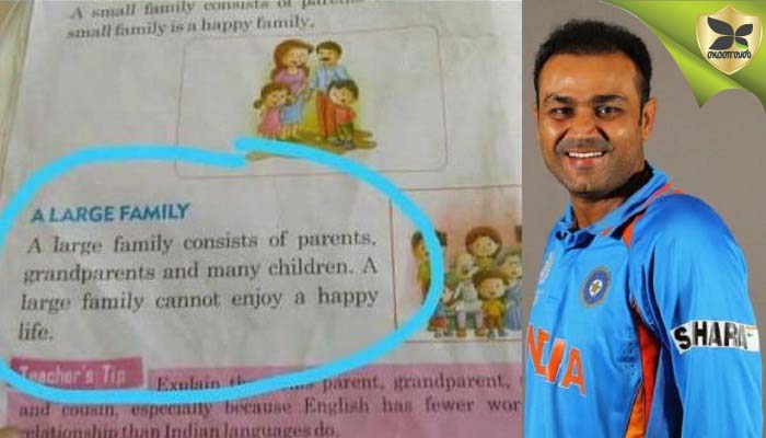 20,ஆடி,தமிழ்தொடர்ஆண்டு-5120: நடுவண் இடைநிலைக் கல்வி வாரியப் பாடத்தில் குடும்ப அமைப்பு குறித்த விளக்கம் ஒன்றை பார்த்துவிட்டு, கிரிக்கெட் வீரர் சேவாக் தன்னுடைய கடுமையான விமர்சனத்தை பதிந்து இருக்கிறார். கிரிக்கெட் மட்டுமில்லாமல் அரசியல், சமுதாயம் குறித்து கீச்சு பதிவிட்டு வருகிறார் கிரிக்கெட் வீரர் சேவாக். இந்தநிலையில் நடுவண் இடைநிலைக் கல்வி வாரியப் பாடத்தில்; குடும்ப அமைப்பு குறித்த விளக்கம் ஒன்றை பார்த்துவிட்டு சேவாக் தனது கண்டனத்தை தெரிவித்துள்ளார். பாடம் ஒன்றில் உள்ள விளக்கத்தில், கூட்டு குடும்பம் என்பது முதியவர்கள் முதல் குழந்தைகள் வரை எல்லோரும் ஒன்றாக இருப்பது. கூட்டு குடும்பத்தில் நிம்மதியாக இருக்க முடியாது என்று பாடம் அமைந்துள்ளது. இதைத்தான் அவர் பகிர்ந்து கண்டனம் செய்துள்ளார். மேலும், இதுபோல நிறைய மோசமான விசயங்கள் பள்ளி புத்தகத்தில் உள்ளது. இதை படித்து பார்த்து வெளியிடும் கல்;வியாளர்கள் சரியான முன் தயாரிப்புகளில் ஈடுபடுவதே இல்லையா? என்று கேட்டுள்ளார். அவரது கருத்துக்கு பலரும் ஆதரவு தெரிவித்து வருகிறார்கள். -தமிழர்க்குத் தொடர்ஆண்டு மட்டுமல்ல தொடர் நாள் கணக்கும் உண்டு. இன்று தமிழ்தொடர்நாள் எண்: 18,69,870.