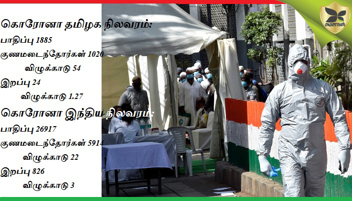 ஒட்டு மொத்த இந்தியாவில் கொரோனாவிற்கு இரண்டாவது இடத்தில் இருந்த தமிழகம் படிப்படியாக ஆறாவது இடத்திற்கு இறங்கியுள்ள நிலையில் குணமளிப்பதில் தமிழகம் முதலிடத்திலும், இறப்புச் சோகத்தில் கடைசி இடத்திலும் அமைந்து தமிழகத்தின் மருத்துவத்துறை சாதனை படைத்து வருகிறது. 13,சித்திரை,தமிழ்தொடர்ஆண்டு-5122: தமிழகத்தில் இன்று ஒரு நாளில் கொரோனா தொற்றால் பாதிக்கப்பட்டவர்கள் எண்ணிக்கையில் 64 பேர்கள் கூடியுள்ள நிலையில், தமிழகத்தில் இதுவரை கொரோனாவால் பாதிக்கப்பட்டவர்களின் எண்ணிக்கை 1885 ஆக உயர்ந்துள்ளது. தமிழகத்தில் இன்று ஒரு நாளில் 60 பேர்கள் குணம் அடைந்து வீடு திரும்பி உள்ளனர். இதன் மூலம் குணம் அடைந்து வீடு திரும்பியவர்களின் எண்ணிக்கை 1020 ஆக உயர்ந்துள்ளது. இன்று ஒரு நாளில் செங்கல்பட்டு மருத்துவமனையில் 13 பேர்களும், திருவாரூரில் 12 பேர்களும், தஞ்சையில் 10 பேர்களும், சென்னையில் 9 பேர்களும், மதுரையில் 8 பேர்களும், கன்னியாகுமரியில் பேர்களும், குணம் அடைந்து வீடு திரும்பி உள்ளனர். தமிழகத்திலேயே இதுவரை அதிகபட்சமாக கோவை தொழிலாளர் காப்புறுதி மருத்துவமனையில் 185 பேர்கள் குணம் அடைந்து வீடு திரும்பி உள்ளனர், அதற்கு அடுத்தபடியாக கரூர் மருத்துவக்கல்லூரி மருத்துவமனையில் 144 பேர்கள் குணம் அடைந்து வீடு திரும்பி உள்ளனர். தமிழகத்தில் இன்று ஒரு நாளில் மட்டும் 6621 பேர்களுக்கு கொரோனா நுண்ணுயிரி பரிசோதனை நடத்தப்பட்டுள்ளது. ஒட்டுமொத்தமாக 79586 பேர்களுக்கு பரிசோதனை நடத்தப்பட்டு உள்ளது. அதில் 1855 பேர்களுக்கு கொரோனா உறுதி செய்யப்பட்டுள்ளது. இதுவரை 87605 ரத்த மாதிரிகள் கொரோனா பரிசோதனைக்கு உட்டுப்படுத்தப்பட்டுள்ளன. இன்று ஒரு நாளில் மட்டும் 7485 மாதிரிகள் பரிசோதிக்கப்பட்டுள்ளன. இன்று 39 ஆண்களுக்கும், 25 பெண்களுக்கும் கொரோனா உறுதி செய்யப்பட்டுள்ளன. தமிழகத்தில் தற்போதைய நிலையில் 838 பேர்கள் கொரோனா பாதிப்புடன் சிகிச்சை பெற்று வருகிறார்கள். மற்றவர்கள் குணம் அடைந்து வீடு திரும்பி விட்டார்கள். இதுவரை கொரோனாவால் தமிழகத்தில் உயிரிழந்தவர்களின் எண்ணிக்கை 24 ஆக உயர்ந்துள்ளது. நடுவண் நலங்குத்துறை அமைச்சகம் வெளியிட்ட தகவலின் படி, இந்தியாவில் கொரோனா பாதித்தவர்கள் எண்ணிக்கை 26917 ஆக உயர்ந்துள்ளது. கடந்த 24 மணி நேரத்தில் மட்டும் 1975 பேர் புதிதாக கொரோனாவால் பாதிக்கப்பட்டுள்ளனர். கொரோனா பாதிப்பில் இருந்து 5914 பேர் மீண்டுள்ளனர். கொரோனாவால் உயிரிழந்தோர் எண்ணிக்கை 826 ஆக உயர்ந்துள்ளது. மாநில அளவில் அதிகபட்சமாக மராட்டியத்தில் 7628 பேருக்கு கொரோனா தொற்று உறுதியாகியுள்ளது. குஜராத்தில் 3071 பேர் கொரோனாவால் பாதிக்கப்பட்டுள்ளனர். தலைநகர் டெல்லியில் 2625 பேருக்கு கொரோனா தொற்று உறுதி செ