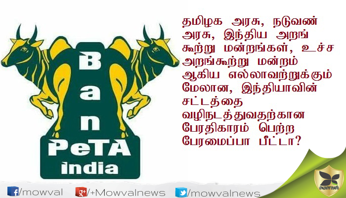 20,ஐப்பசி,தமிழ்தொடர்ஆண்டு-5119: சல்லிக்கட்டுக்குத் தடை விதித்து கடந்த 22,சித்திரை,தமிழ்தொடர்ஆண்டு-5116 (05.05.2014) உச்ச அறங்கூற்றுமன்றம் வழங்கிய தீர்ப்பைத் தொடர்ந்து தமிழ்நாட்டில் பாரம்பரிய விளையாட்டான சல்லிக்கட்டு நடைபெறாத சூழல் நிலவியது. இதனால் சல்லிக்கட்டு மீதான தடையை நீக்க வலியுறுத்தி மாணவர்களும், இளைஞர்களும், பொதுமக்களும் பெருமளவில் திரண்டு போராட்டங்களை மேற்கொண்டனர். இந்த நிலையில் சல்லிக்கட்டு நடத்தும் வகையில், மிருகவதை தடை சட்டத்தின் சில பிரிவுகளில் திருத்தங்கள் மேற்கொண்டு தமிழக அரசு கடந்த 08,தை,தமிழ்தொடர்ஆண்டு-5119ல் (21.01.2017) அவசர சட்டம் பிறப்பித்தது. அதைத்தொடர்ந்து 10,தை,தமிழ்தொடர்ஆண்டு-5119ல் (23.01.2017) நடைபெற்ற சட்டமன்றச் சிறப்பு கூட்டத்தில் சல்லிக்கட்டுக்கு ஆதரவான சட்ட மசோதா ஒருமனதாக நிறைவேற்றப்பட்டது. இதற்கு குடியரசுத் தலைவர் பிரணாப் முகர்ஜி ஒப்புதல் அளித்தார். இதனால் அந்த மசோதாவுக்கு சட்ட அங்கீகாரம் கிடைத்தது. இதன் மூலம் தமிழர்களின் பாரம்பரியமான சல்லிக் கட்டை மீட்டெடுக்க தமிழக அரசு, அரசியல் கட்சியினர், மாணவர்கள், இளைஞர்கள், தமிழ் ஆர்வலர்கள் என பல்வேறு தரப்பினரும் அயராது மேற்கொண்ட முயற்சிக்கு வெற்றி கிடைத்தது. தமிழகத்தின் பல்வேறு இடங்களில் சல்லிக்கட்டு நடைபெற்றது. இதற்கிடையே ‘பீட்டா’ மற்றும் பல்வேறு விலங்குகள் நல அமைப்புகள் தமிழக அரசு பிறப்பித்த சட்டத்திற்கு எதிராக உச்ச அறங்கூற்றுமன்றத்தில் வழக்கு தொடர்ந்தன. இவ்வழக்குகளை விசாரணைக்கு ஏற்றுக் கொண்ட உச்ச அறங்கூற்றுமன்றம் தமிழக அரசுக்கு அறிக்கை விடுத்து உள்ளது. தலைமை அறங்கூற்றுவர் தீபக் மிஸ்ரா தலைமையிலான அமர்வு இவ்வழக்கு தொடர்பாக பதிலளிக்க தமிழக அரசுக்கு 4 வார காலம் அவகாசம் வழங்கி உள்ளது. உச்ச அறங்கூற்றுமன்றம் இதுவரையில் தமிழக அரசு கொண்டுவந்த சட்டத்திற்கு தடைவிதிக்க மறுத்துவிட்டது. பீட்டா தன்னுடைய மனுவில் விசாரணை அறிக்கையையும் பதிகை செய்து உள்ளதாம். தமிழகத்தில் அவனியாபுரம், பாலமேடு, திருநல்லூர், மறவப்பட்டியில் சல்லிக்கட்டு போட்டி நடைபெற்ற போது எடுக்கப்பட்ட காணொளிகள் மற்றும் புகைப்படங்கள் அடங்கிய ஆவணங்களை பதிகை செய்து உள்ளதாம். தமிழக அரசு, நடுவண் அரசு, இந்திய அறங்கூற்று மன்றங்கள், உச்ச அறங்கூற்று மன்றம் ஆகிய எல்லாவற்றுக்கும் மேலான, இந்தியாவின் சட்டத்தை வழிநடத்துவதற்கான பேரதிகாரம் பெற்ற பேரமைப்பா பீட்டா? என்று தமிழகத்தின் எளிய பாமரன் கேட்கிறான்!