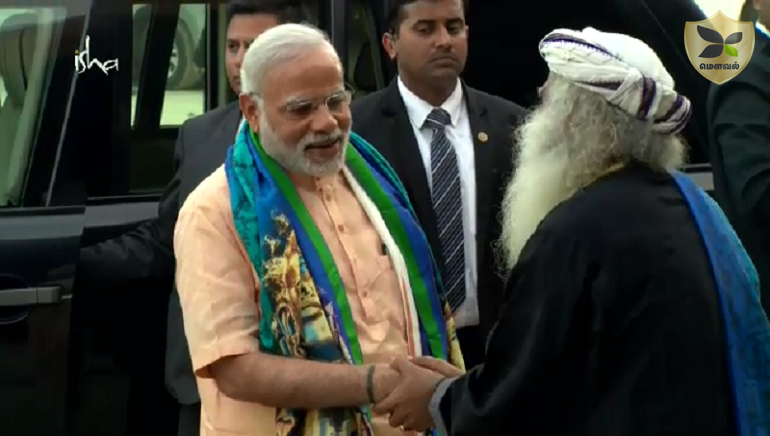 விழாவில் கலந்துகொண்ட பிரதமர் மோடிக்கு ஆதியோகி படம் இடம்பெற்ற சால்வை ஒன்றினை சக்கி