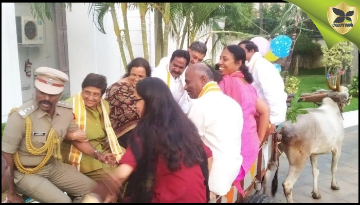 இரண்டு மாடுகள் பூட்டப்பட்ட வண்டி ஒன்றின் மீது கிரண்பேடி மற்றும் அவரது பாதுகாப்பு அதிகாரிகள், உதவியாளர்கள் உள்ளிட்ட 10 பேர் அமர்ந்து ஆளுநர் மாளிகைக்குள் வலம் வந்தனர். இந்தப் புகைப்படத்தை குடும்ப விழா என்று தலைப்பிட்டு கீச்சுவில் பகிர்ந்தார் கிரண்பேடி. 29,மார்கழி,தமிழ்தொடர்ஆண்டு-5121: சல்லிக்கட்டு திருவிழாவுக்கு ஆதரவாக ஒட்டுமொத்தத் தமிழகமும் ஒரே புள்ளியில் நின்று குரலெழுப்பிய தருணம் அது. சென்னையில் இந்தியா டுடே நடத்திய நிகழ்ச்சியில் கலந்துகொண்ட கிரண்பேடி, சல்லிக்கட்டு தமிழர்களின் பாரம்பர்ய திருவிழாவாக இருந்தாலும், காளைகள் துன்புறுத்தப்படுகின்றன. அதனால்தான் சல்லிக்கட்டுக்குச் சட்டத்தின் மூலம் தடை விதிக்கப்பட்டிருக்கிறது. உச்ச அறங்கூற்றுமன்றமும் அதை உறுதிப்படுத்தியிருக்கிறது. அதனால் சல்லிக்கட்டு நடத்தத் தேவையில்லை என்று கூறினார். அப்போது அதே மேடையில் அவருக்குப் பதிலடி கொடுக்கும் விதமாகப் பேசிய ஆர்.ஜே பாலாஜி, நீங்கள் காலில் அணிந்திருக்கும் தோல் செருப்பு எதிலிருந்து வந்தது? மாட்டை அறுத்து அதன் தோலை ஏற்றுமதி செய்கிறார்களே அது சித்ரவதை இல்லையா? அந்த நிறுவனங்களை முதலில் தடை செய்யுங்கள் என்று கூறினார். கிரண்பேடியின் அந்தக் கருத்துக்கு எதிர்க்கருத்துக்கள் இணையத்தை தீயாக்கின. தமிழகம், புதுச்சேரியில் அவருக்கெதிரான போராட்டங்கள் இளைஞர்களால் முன்னெடுக்கப்பட்டன. தற்போது அதே கிரண்பேடி, ஆளுநர் மாளிகையில் பணிபுரியும் அதிகாரிகள் மற்றும் ஊழியர்களின் குடும்பத்தினருடன் பொங்கல் விழாவைக் கொண்டாடுவதாக மாடுகளைத் துன்புறுத்தியுள்ளார். 2 மாடுகள் பூட்டப்பட்ட வண்டி ஒன்றின் மீது கிரண்பேடி மற்றும் அவரது பாதுகாப்பு அதிகாரிகள், உதவியாளர்கள் உள்ளிட்ட 10 பேர் அமர்ந்து ஆளுநர் மாளிகைக்குள் வலம் வந்தனர். இந்தப் புகைப்படத்தை குடும்ப விழா என்று தலைப்பிட்டு கீச்சுவில் பகிர்ந்தார் கிரண்பேடி. எதிர்க்கருத்துக்களால் இணையத்தைத் தெறிக்க விட்டுக் கொண்டிருக்கிறார்கள் இணைய ஆர்வலர்கள். எது உண்மையான கிரண்பேடி! நேற்று மாட்டுக்காக அழுத கிரண்பேடி- இன்று மாட்டை அழவிடும் கிரண்பேடி. எப்போதும் தமிழர்கள் எதிர்நிலை போணுகிற பாஜக பிழைப்பாளியே கிரண்பேடி. -தமிழர்க்குத் தொடர்ஆண்டு மட்டுமல்ல, தொடர் நாள் கணக்கும் உண்டு. இன்று தமிழ்த் தொடர்நாள் எண்:18,70,396.