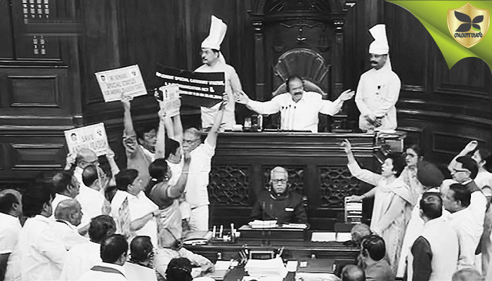 19,பங்குனி,தமிழ்தொடர்ஆண்டு-5119: நாடாளுமன்ற இரு அவைகளும் பதினெட்டாவது நாளாக இன்றும் முடங்கின. நாடாளுமன்ற வரவு-செலவு கூட்டத்தொடரின் இரண்டாவது பாகம் நடைபெற்று வருகிறது. இதன் கடைசி கிழமையின் தொடக்க நாளான இன்றும் மக்களவை கூடியவுடன் அதிமுக உறுப்பினர்கள் காவிரி மேலாண்மை வாரியம் அமைக்கக் கோரி அமளியில் ஈடுபட்டனர். தங்கள் கைகளில் காவிரி பிரச்சினையை குறிப்பிட்டு பதாகைகளை ஏந்தியிருந்தனர். காங்கிரஸ், தேசியவாத காங்கிரஸ், தெலுங்குதேசம், ராஷ்டிரிய ஜனதா தளம் மற்றும் இடதுசாரி கட்சிகளின் உறுப்பினர்கள் தங்கள் இருக்கைகளில் எழுந்து நின்றபடி இருந்தனர். தங்கள் அளித்த நம்பிக்கையில்லா தீர்மானத்தை விவாதத்திற்கு எடுக்க வேண்டும் என வலியுறுத்தியபடி இருந்தனர். காங்கிரஸ் எதிர்க்கட்சி தலைவரான மல்லிகார்ஜுனா கார்கே, தாழ்த்தப் பட்ட மற்றும் மலைச்சாதியினர்களுக்கு எதிராக மோடி அரசு செயல்படுவதையும், நடுவண் இடைநிலைக் கல்வி வாரிய வினாத்தாள்கள் வெளியானதன் மீதும் அவையில் விவாதிக்க விரும்புகிறோம் எனக் குறிப்பிட்டார். அவை கூடிய சில நிமிடங்களில் கேள்வி நேரமும் நடைபெறாமல் நண்பகல் 12 மணி வரை ஒத்தி வைக்கப்பட்டது. பிறகு மீண்டும் கூடிய மக்களவையில் அமளி தொடரவே இன்று நாள் முழுவதிலும் ஒத்திவைக்கப்பட்டது. இதேபோல், மாநிலங்களவையிலும் காங்கிரஸ் மற்றும் பகுஜன் சமாஜ் கட்சிகள் நடுவண் அரசு மிகவும் பிற்படுத்தப்பட்ட சமூகத்திற்கு எதிராக செயல்படுவதாகக் கூறி முழக்கம் எழுப்பியது. பல்வேறு வங்கிகளின் ஊழலை விசாரிக்க வேண்டும் என வலியுறுத்தி திரிணமூல் காங்கிரஸ். அமளி செய்தது. சிறப்பு தகுதி வேண்டி தெலுங்தேசம் கோர, காவிரி பிரச்சினையை முன்வைத்து திமுக, அதிமுக உறுப்பினர்களும் அமளியில் ஈடுபட்டனர். இது, அவையின் துணைத்தலைவர் எம்.வெங்கய்யநாயுடு தனது இருக்கையில் அமருவதற்கு முன்பாகவே தொடங்கப்பட்டு விட்டது. இதனால், அவையில் எந்த நடவடிக்கையையும் மேற்கொள்ள முடியாமல் போனது. நாளை மீண்டும் கூடவிருக்கும் இரு அவைகளிலும் எதிர்க்கட்சிகளின் இந்த அமளி தொடராமல் இருக்க, மோடி அரசுக்கு எதிர்கட்சிகள் முன்வைக்கிற எந்தப் பிரச்சனையையும் தீர்த்து வைக்க வேண்டும் என்கிற எண்ணம் துளியும் வரவில்லை என்றே தெரிகிறது. -தமிழர்க்குத் தொடர்ஆண்டு மட்டுமல்ல தொடர் நாள் கணக்கும் உண்டு. இன்று தமிழ்தொடர்நாள் எண்: 18,69,745.