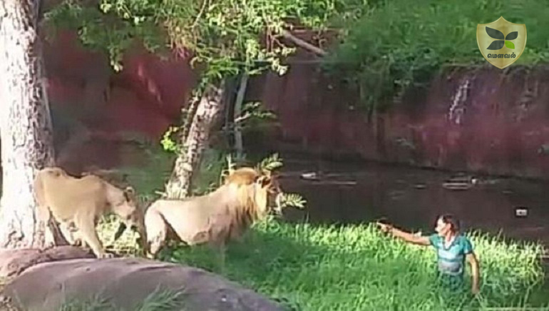 குகையில் இருக்கும் அகழியாக இருந்திருந்தால் முகேஷ் புலிக்கு இரையாகியிருப்பார். சிங்கங்கள் பாப்பையா வைத்த உணவை நோக்கி திரும்பிய நேரம் பூங்கா