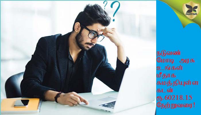 10,தை,தமிழ்தொடர்ஆண்டு-5120: இந்தியத் தலைமை அமைச்சர் மோடி தலைமையிலான பாஜக ஆட்சியில் நாட்டின் கடன் 50 விழுக்காடு உயர்ந்து, ரூ.82 லட்சம் கோடியாக அதிகரித்துள்ளது என்று நடுவண் அரசு வெளியிட்ட அறிக்கையில் தெரிவிக்கப்பட்டுள்ளது. நடுவண் அரசின் கடன் குறித்த 8-வது ஆய்வறிக்கையில் இந்தத் தகவலை நடுவண் நிதி அமைச்சகம் தெரிவித்துள்ளது. கடந்த தமிழ்தொடர்ஆண்டு-5116 வைகாசி மாதக் (சூன்-2014) கணக்கின்படி இந்திய நாட்டின் கடன் ரூ.54 லட்சத்து 90 ஆயிரத்து 763 கோடியாக இருந்தது. அதன்பின் பாஜக தலைமையிலான தேசிய ஜனநாயகக் கூட்டணி ஆட்சிப் பொறுப்பேற்று, தலைமை அமைச்சராக மோடி வந்தபின் நாட்டின் கடன் தமிழ்தொடர்ஆண்டு-5120 ஆவணி மாதக் (செப்டம்பர்-2018) கணக்கின்படி ரூ.82 லட்சத்து 3 ஆயிரத்து 253 கோடியாக அதிகரித்துள்ளது என்று நிதி அமைச்சகம் தெரிவித்துள்ளது. கடந்த நான்கரை ஆண்டுகளில் அரசின் கடன் 50 விழுக்காடு அதிகரித்துள்ளது. இந்திய அரசின் பொதுக்கடன் ரூ.48 லட்சம் கோடியாக இருந்த நிலையில், கடந்த நான்கரை ஆண்டுகளில் 51.7 விழுக்காடு உயர்ந்து, ரூ.73 லட்சம் கோடியாக அதிகரித்துள்ளது. உள்நாட்டுக் கடன் 54 விழுக்காடு அதிகரித்து ரூ.68 லட்சம் கோடியாக அதிகரித்துள்ளது. சந்தையில் நடுவண் அரசு கடன் பெற்ற அளவும் 47.5 விழுக்காடு அதிகரித்து, ரூ.52 லட்சம் கோடியாக உயர்ந்துள்ளது. தங்க விற்பனை பத்திரத்தின் மூலம் கடன் ஏதும் இல்லாது இருந்த நிலையில், மோடி அரசு தற்போது ரூ.9 ஆயிரத்து 89 கோடி முற்றிலும் புதியதாக கடன் பெற்றுள்ளது. இந்தியாவில் நேற்று வரை பிறந்துள்ள குழந்தை உட்பட இந்தியாவின் மக்கள் தொகையை 'உலகோ கணக்கீட்டுக் கருவி' (WORLD O METER) என்ற ஒரு நிறுவனம் பிறப்பு, இறப்பு அடிப்படையில் வினாடிக்கு இருவர் என இந்தியாவில் மக்கள்தொகை கணக்கில் கூடுவதாகக் கணக்கிட்டு வருகிறது. அந்தக் கணக்கீட்டின் படி நேற்று வரை இந்தியாவின் மக்கள் தொகை 136,22,55,678 ஆகும். இந்தியாவில் நேற்று வரை பிறந்துள்ள குழந்தை உட்பட தலைக்கு ரூபாய் 60218.15 கடன் பெற்றுள்ளது. உங்களுக்கு தனிப்பட்ட வகையில் கடன் ஏதும் இல்லையென்றாலும், இந்தியக் குடிமகன் என்ற வகையிலும் மோடியை ஆட்சிக்குத் தேர்ந்தெடுத்தவர் என்ற வகையிலும் நேற்றைய கணக்கின் படி உங்கள் ஒவ்;வொருவர் மீதும் ரூபாய் 60218.15 கடன் இருக்கிறது. நீங்கள் சம்பாதித்து, உங்கள் குடும்பத்தையும் காப்பாற்றி, பிள்ளைகளைப் படிக்க வைத்து, பிள்ளைகளுக்கு திருமணம் செய்து வைத்து, நாட்டைக் காப்பற்ற வரியும் செலுத்துகின்றீர்கள். ஆனாலும் நீங்கள் கடன் இல்லாமல் வாழ ஆசைப்படுகின்றீர்கள். நீங்கள்; தேர்ந்தெடுத்த அரசு: தொழில் வணிக நிறுவனங்களை நடத்தியும் சம்பாதிக்கிறது. வரி மூலமாகவும் சம்பாதிக்கிறது. சாராய வணிகம் செய்தும் சம்பாதிக்கிற