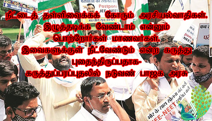 நீட் தேர்வு வேண்டும் என்பது பெற்றோர் மற்றும் மாணவர்களின் அழுத்தம் என்பதாகக் காட்டும் கருத்துப்பரப்புதலில் ஈடுபட்டிருக்கிறது நடுவண் பாஜ அரசு. நீட் தேர்வே வேண்டாம். நடத்தித் தொலைப்பது என்றால், நீட் தேர்வை இழுத்தடிக்க வேண்டாம் என்பதே பெற்றோர் மற்றும் மாணவர்களின் கவலை! 11,ஆவணி,தமிழ்த்தொடராண்டு-5122: தமிழ்நாடு பொறியியல் கல்லூரிகளுக்கு விண்ணப்பித்த மாணவர்கள்- பனிரெண்டாம் வகுப்பில் கணக்கு, பரியியல், வேதியியல் பாடங்களில் எடுத்த மதிப்பெண்கள் அடிப்படையில் தரவரிசை எண் வழங்கப்படுகிறது. தரவரிசை அடிப்படையில் மாணவர்களுக்கு அவரவர்கள் விரும்பும் கல்லூரிகளைத் தேர்ந்தெடுக்க வாய்ப்பு வழங்கப்படுகிறது. இந்த எளிமையான முறை நீண்ட காலமாக சிக்கல் இல்லாமல் பின்பற்றப்பட்டு வருகிறது. நடுவண் அரசின் பொறியியல் தொழில் நுட்பக் கல்லூரிகளில் கூட்டு நுழைவுத் தேர்வு (ஜெஇஇ) மூலமாக தரவரிசை பட்டியல் தயாரிக்கப்பட்டு மாணவர் சேர்க்கை நடத்தப்படுகிறது. இந்தக் கல்லூரிகளுக்கு இடையே, கல்வித் தரத்திலோ கட்டணத்திலோ பெரிய ஏற்றதாழ்வு இருக்காது. சொந்த ஊருக்கு அருகாமையில், தொலைவில் என்பது மட்டுமே மாறுபடும். மேல்தட்டு மக்கள் மட்டுமே மோதுவார்கள். இலக்கு வைத்த மாணவர்கள் அனைவருக்கும் இடம் கிடைத்துவிடும். கீழ்த்தட்டு மாணவர்கள் களத்திற்கே வரமாட்டார்கள். ஆனால் தமிழ்நாடு பொறியியல் கல்லூரிகளுக்கு இடையே உச்சபட்ச ஏற்றதாழ்வுகள் உள்ளன. கட்டணம் மிகமிகக் குறைந்த அரசு கல்லூரிகள், மிக அதிகமான கட்டணம்- அனுபவம் நிறைந்த கல்லூரிகள், கட்டணத்தில் ஏதும் சமரசம் செய்து கொள்ளாத அண்மையில் தொடங்கப்பட்ட அனுபவம் இல்லாத கல்லூரிகள் என மூவகையான கல்லூரிகள் உள்ளன. அரசு கல்லூரிகளை மிக அதிக மதிப்பெண் பெற்ற மாணவர்கள் தேர்ந்தெடுத்து விடுவார்கள். அரசு கல்லூரிகள் ஏழை மாணவர்கள் தங்கள் குடும்பத்தை தூக்கி நிறுத்துவதற்கு வாய்ப்பு வழங்கும் கோயிலாகவே பலகாலமாகக் கொண்டாடப்பட்டு வருகின்றன. பணக்காரப் பெற்றோர்கள் மிக அதிகமான கட்டணம் அனுபவம் நிறைந்த கல்லூரிகள் தங்கள் பிள்ளைகளுக்கு வாங்கிக் கொடுத்து விடுவார்கள். பொருளாதார வசதியும் மதிப்பெண்ணும் குறைந்த மாணவர்கள் நாங்களும் பொறியியல் கல்வி பெறுகிறோம் என்று- கட்டணத்தில் ஏதும் சமரசம் செய்து கொள்ளாத அண்மையில் தொடங்கப்பட்ட அனுபவம் இல்லாத கல்லூரிகளில் சேர்ந்து மாணவர்களும் பெற்றோர்களும் போராடுவார்கள். தமிழ்நாட்டில் மருத்துவக் கல்லூரிகளைப் பொறுத்தவரை, நடுவண் பாஜக அரசு நீட் என்கிற ஒரு தேர்வை திணிப்பதற்கு முன்பு வரை பொறியியல் கல்லூpகளுக்குப் பின்பற்றும் அதே முறையை சிக்கல் ஏதும் இல்லாத வகையில் ஏழைகளுக்கு கோயிலாகவும