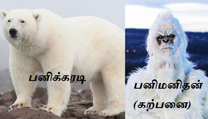 இந்திய இராணுவம் பனிமனிதன் யதி என்று வியந்து கீச்சு செய்திருந்தது. அது இரண்டு நாட்களாக பரபரப்பு கிளப்பிய நிலையில், அது பனிமனிதன் இல்லை பனிக்கரடி என்கின்றனர் நேபாள் அதிகாரிகள். 19,சித்திரை,தமிழ்தொடர்ஆண்டு-5121: மனிதனைப் போலவே தோற்றம் கொண்ட பிரம்மாண்ட விலங்கினம்: அதன் பெயர் யதி அல்லது எட்டி யென்றும், அது பனி மனிதன் என்றும், உலா வரும் நம்பிக்கையின் அடிப்படையில், இந்திய இராணுவம், இமய மலைக் காடுகளில் வசிக்கும் பனி மனிதனின் காலடித்தடம் ஒன்றை கண்டதாக புகைப்படம் ஒன்றை கீச்சு செய்து இரண்டு நாட்களாக பரபரப்பு கிளப்பியிருந்தது இமய மலைக் காடுகளில் இந்திய ராணுவம் கண்டது பனிமனிதனின் கால்தடம் இல்லை. பனிக்கரடியின் கால்தடம் என்றும் நேபாள் அதிகாரிகள் கூறியுள்ளனர். இமய மலைக் காடுகளில் வசிப்பதாக நம்பி பனி மனிதனின் காலடித்தடம் ஒன்றை கண்டதாக இந்திய ராணுவம் புகைப்படம் ஒன்றை கீச்சு செய்திருந்தது. இதை ஆய்வு செய்வதற்காக நேபாளிலிருந்து இமய மலைக்கு அதிகாரிகள் சிலர் வந்திருந்தனர். அவர்கள் இந்திய ராணுவத்துடன் இணைந்து அந்த கால் தடத்தை ஆய்வு செய்ததில் அது பனிமனிதனின் கால்தடம் இல்லை. கரடியின் கால்தடம் என்று தெரியவந்ததாகவும் நேபாள் ராணுவத்தின் செய்தி தொடர்பாளர் கூறியுள்ளார். -தமிழர்க்குத் தொடர்ஆண்டு மட்டுமல்ல தொடர் நாள் கணக்கும் உண்டு. இன்று தமிழ்த் தொடர்நாள் எண்:18,70,140.