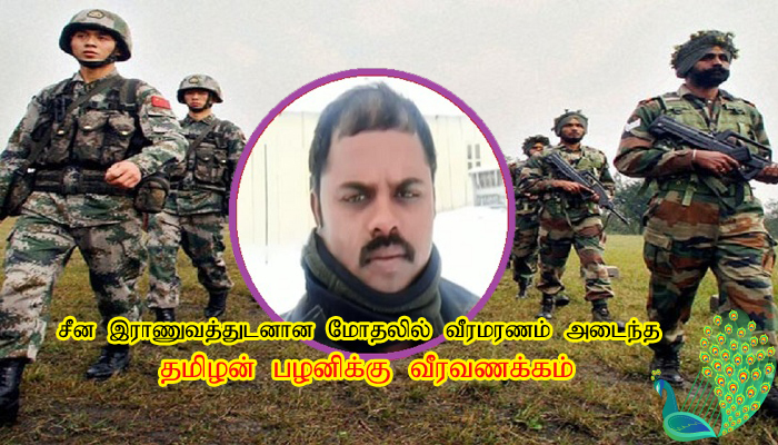 இந்தியாவிற்காக தன் இன்னுயிரை ஈகம் செய்த இராணுவ வீரர் பழனியின் குடும்பத்திற்கு ரூ.20 லட்சம் நிதியுதவி, மற்றும் பழனியின் குடும்பத்தில் ஒருவருக்கு வேலை வழங்குவதாக தமிழ்நாட்டு முதல்வர் அறிவித்துள்ளார். 02,ஆனி,தமிழ்த்தொடராண்டு-5122: இந்தியா-சீன எல்லையில் பதட்டத்தை தணிக்க தொடர்ந்து முயற்சிகள் மேற்கொள்ளப்பட்டு வரும் நிலையில், லடாக் எல்லையின் கல்வான் பள்ளத்தாக்குப் பகுதியில் நேற்று இரவு இரு தரப்பு படைகளுக்குமிடையே மீண்டும் மோதல் ஏற்பட்டது. இதில் இந்திய இராணுவம் தரப்பில் ஒரு அதிகாரி 2 வீரர்கள் என 3 பேர் உயிரிழந்துள்ளனர். அந்த மூவரில் ஒருவர் தமிழர் என்பதில், இந்திய இராணுவத்தில் தமிழர்கள் கூடுதலாக இடம் பெற்றிருக்கின்றனர் என்பது தெரிய வருகிறது. இந்த மோதலில் சீன இராணுவம் நடத்திய தாக்குதலில் இராமநாதபுரம் மாவட்டத்தைச் சேர்ந்த நாற்பது அகவை, பழனி என்ற தமிழக வீரர் வீரமரணம் அடைந்துள்ளார். தமிழ்நாட்டில், இராமநாதபுரம் மாவட்டம் திருவாடானை அருகே உள்ள கடுக்கலூர் கிராமத்தைச் சேர்ந்தவர் பழனி. கடந்த 22 ஆண்டுகளாக இந்திய இராணுவத்தில் பணியாற்றி வந்தார். இந்தியாவிற்காக தன் இன்னுயிரை ஈகம் செய்த இராணுவ வீரர் பழனியின் குடும்பத்திற்கு ரூ.20 லட்சம் நிதியுதவி, மற்றும் பழனியின் குடும்பத்தில் ஒருவருக்கு வேலை வழங்குவதாக தமிழ்நாட்டு முதல்வர் அறிவித்துள்ளார்.