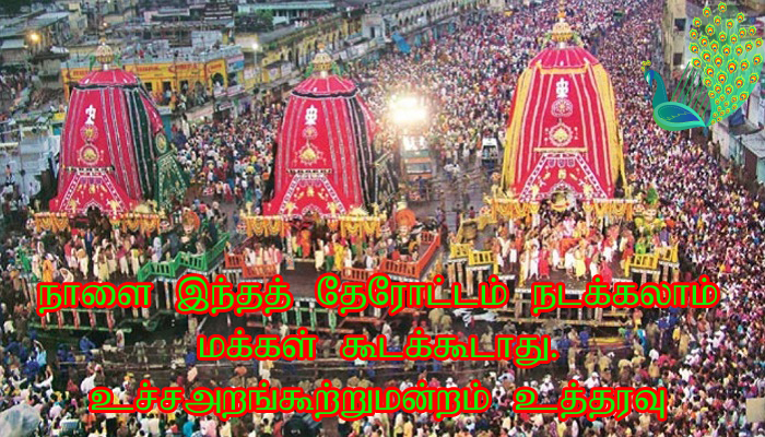 ஒடிசா மாநிலத்தில் உள்ள புரி ஜெகன்நாதர் கோயில் தேரோட்டம், பொதுமக்கள் பங்களிப்பு இல்லாமல் நாளை நடைபெறும். 08,ஆனி,தமிழ்த்தொடராண்டு-5122: ஒடிசா மாநிலத்தில் உள்ள புரி ஜெகன்நாதர் கோயில் தேரோட்டம் நாளை நடைபெற இருந்தது. கொரோனா பரவல் காரணமாக, இந்தத் தேரோட்டததைத் தள்ளி வைக்க வேண்டும் என ஒடிசா விகாஸ் பரிஷத் என்ற தொண்டு நிறுவனத்தின் சார்பில் உச்சஅறங்கூற்றுமன்றத்தில் வழக்கு தொடரப்பட்டது. இலட்சக்கணக்கான பக்தர்கள் கூடும் இந்தத் தேரோட்ட விழாவை தற்போது நடத்தினால் ஏராளமானோருக்கு கொரோனா தொற்று ஏற்பட வாய்ப்புள்ளது என அந்த தொண்டு நிறுவனம் அளித்த மனுவில் கூறப்பட்டிருந்தது. கடந்த வியாழனன்று இந்த தேரோட்டத்திற்கு தடை விதித்தது உத்தரவிட்டது. இந்தத் தேரோட்டம் நடத்த அனுமதித்தால் ஜெகன்நாதர் நம்மை மன்னிக்கமாட்டார். தற்போதைய கொரோனா சூழலில் ஏராளமான மக்கள் கூடுவதை அறங்கூற்றுமன்றம் ஏற்றுக்கொள்ளவில்லை. மக்களின் நலன் கருதி இந்தத் தேரோட்டத்திற்கு தடை விதிக்கப்படுகிறது என்று அறங்கூற்றுவர்கள் தெரிவித்தனர். இந்நிலையில் அறங்கூற்றுவர்களின் தீர்ப்பை மறுபரிசீலனை செய்யுமாறு சீராய்வு மனுக்கள் பதிகை செய்யப்பட்டன. பூரி ஜெகன்நாதர் கோயிலின் சங்கராச்சாரி சாமி நிஸ்சாலந்த சரஸ்வதி, கோயிலின் தேரோட்டத்தை நடத்துவதற்கான பாதுகாப்பு திட்டங்கள் அனைத்தும் தயார் நிலையில் உள்ளதாக தெரிவித்தார். இந்நிலையில் நீதிபதிகளின் தீர்ப்பை மறுபரிசீலனை செய்யுமாறு சுப்ரீம் கோர்ட்டில் சீராய்வு மனுக்கள் தாக்கல் செய்யப்பட்டன. பூரி ஜெகன்நாதர் ஆலயத்தின் சங்கராச்சாரியர் சுவாமி நிஸ்சாலந்த சரஸ்வதி, ஆலயத்தின் ரத யாத்திரையை நடத்துவதற்கான பாதுகாப்பு திட்டங்கள் அனைத்தும் தயார் நிலையில் உள்ளதாக தெரிவித்தார். இதனைத் தொடர்ந்து இந்த வழக்கு இன்று அறங்கூற்றுவர் ரவீந்திர பட் முன்னிலையில் விசாரணைக்கு வந்த போது, தேரோட்டத்திற்கு பொதுமக்கள் பங்களிப்பு இல்லாமல் அனுமதி அளிக்குமாறு நடுவண் அரசு வாதிட்டது. கொரோனா நுண்நச்சு தொற்றுநோயைக் கருத்தில் கொண்டு பொதுமக்கள் பங்களிப்பு இல்லாமல் இந்த ஆண்டு பூரி ஜெகன்நாத் தேரோட்டம் நடத்த அனுமதிக்கலாம். பல நூற்றாண்டுகளின் பாரம்பரியம் நிறுத்தப்படக்கூடாது. இது கோடிக்கணக்கான மக்களின் நம்பிக்கைக்குரிய பாடு. ஜெகன்நாதர் நாளை வெளியே வராவிட்டால், அவர் பாரம்பரியங்களின்படி 12 ஆண்டுகள் வெளியே வர முடியாது என்று நடுவண் அரசின் சொலிசிட்டர் ஜெனரல் துஷார் மேத்தா வாதாடினார். இதனையடுத்து ஓடிசா மாநிலம், பூரி ஜெகநாதர் கோயில் தேரோட்டத்திற்கு அனுமதியளித்து உச்சஅறங்கூற்றுமன்றம் தீர்ப்பளித்துள்ளது. 12 நாட்கள் நடைபெறும் பூரி ஜெகநாதர் க