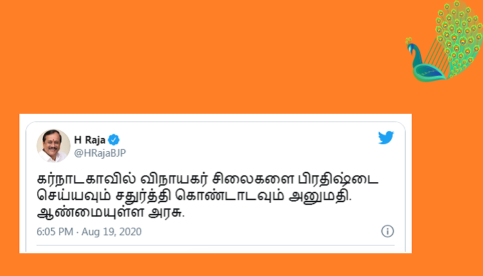 “கர்நாடகாவில் விநாயகர் சிலைகளைப் பிரதிஷ்டை செய்யவும் சதுர்த்தி கொண்டாடவும் அனுமதி. ஆண்மையுள்ள அரசு" என்று எச்.இராஜா பதிவிட்டுள்ளார். அவருடைய கூற்று ஏற்புடையதாக இல்லையே! உண்மையில் எது ஆண்மையுள்ள அரசு என்ற விவாதம் இணையத்தில் ஓடிக் கொண்டிருக்கிறது. 04,ஆவணி,தமிழ்த்தொடராண்டு-5122: கர்நாடக மாநிலத்தில் விநாயகர் சிலைகளை வைத்துக் கொள்ளவும், சதுர்த்தியைக் கொண்டாடவும் அனுமதி அளிக்கப்பட்டுள்ளதை குறிப்பிட்டு, அதனை ஆண்மையுள்ள அரசு எனக் கூறி, பாஜகவின் தேசியச் செயலாளர் எச்.இராஜா கீச்சுப் பதிவை வெளியிட்டுள்ளார். தமிழகத்தில் நாளை மறுநாள் பிள்ளையார் சதுர்த்தி கொண்டாடப் படவுள்ளது. இதையொட்டி அண்மைக்கால வழக்கப்படி, பொது இடங்களில் விநாயகர் சிலைகளை நிறுவ அனுமதிக்க வேண்டும் என்று ஹிந்து அமைப்புகள் கோரிக்கை விடுத்தன. ஆனால், கொரோனாவால் ஏற்பட்டுவரும் பாதிப்புகளைக் கருத்தில்கொண்டு விநாயகர் சதுர்த்திக்கு சிலைகளை அமைத்து, ஊர்வலம் நடத்துவதற்கு தமிழக அரசு தடை விதித்துள்ளது. இந்தத் தடை உத்தரவை எதிர்த்து சென்னை உயர் அறங்கூற்றுமன்ற மதுரை கிளையில் வழக்குத் தொடரப்பட்டது. அதில், மாநிலம் முழுவதும் நாள்தோறும் சராசரியாக ஆறாயிரம் பேருக்கு கொரோனா நோய்த்தொற்று கண்டறியப்பட்டுவரும் நிலையில், விநாயகர் சதுர்த்தி ஊர்லலம் கட்டாயமா? என்று அறங்கூற்றுமன்றம் கேள்வியெழுப்பியுள்ளது. இந்த நிலையில், விநாயகர் சதுர்த்தியைக் கொண்டாட கர்நாடக மாநில அரசு அனுமதி அளித்துள்ளதைக் குறிப்பிட்டு, பாஜகவின் தேசிய செயலாளர் எச்.இராஜா வழக்கம்போல் இயல்புக்குப் பொருந்தாத பொய்மையை முன்னெடுக்கும் பதிவை வெளியிட்டுள்ளார். இதுதொடர்பாக அவர் வெளியிட்டுள்ள கீச்;சுப் பதிவில், “கர்நாடகாவில் விநாயகர் சிலைகளைப் பிரதிஷ்டை செய்யவும் சதுர்த்தி கொண்டாடவும் அனுமதி. ஆண்மையுள்ள அரசு" என்று எச்.இராஜா பதிவிட்டுள்ளார். உண்மையில் எது ஆண்மையுள்ள அரசு என்ற விவாதம் இணையத்தில் ஓடிக் கொண்டிருக்கிறது.