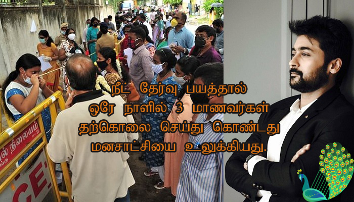அனைவருக்கும் சமமான வாய்ப்புகளை உருவாக்கி தர வேண்டிய அரசாங்கம் ஏற்றத்தாழ்வை உருவாக்குகிற கல்வி முறையைச் சட்டமாக கொண்டு வருகிறது. ஏழை எளிய மாணவர்களின் நிதர்சனம் அறியாதவர்கள் கல்விக் கொள்கைகளை வகுக்கிறார்கள்: போற்றிக் கொள்ள வேண்டிய வைரவரிகள். 29,ஆவணி,தமிழ்த்தொடராண்டு-5122: தமிழகத்தில் நேற்று நீட் தேர்வு பயத்தால் ஒரே நாளில் 3 மாணவர்கள் தற்கொலை செய்து கொண்டது குறித்து நடிகர் சூர்யா நேற்று இரவு வேதனை தெரிவித்து அறிக்கை வெளியிட்டார். அந்த அறிக்கையில் ‘நீட் தேர்வு பயத்தால் ஒரே நாளில் 3 மாணவர்கள் தற்கொலை செய்து கொண்டது மனசாட்சியை உலுக்கியது. தேர்வெழுதப் போகும் மாணவர்களுக்கு வாழ்த்து சொல்வதற்கு பதிலாக ஆறுதல் சொல்வது போல் அவலம் எதுவுமில்லை. கொரோனா தொற்று போன்ற உயிர் அச்சம் மிகுந்த பேரிடர் காலக்கட்டத்தில்கூட மாணவர்கள் தேர்வெழுதி தங்கள் தகுதியை நிரூபிக்க நிர்பந்திக்கப்படுவது வேதனை அளிக்கிறது. அனைவருக்கும் சமமான வாய்ப்புகளை உருவாக்கி தர வேண்டிய அரசாங்கம் ஏற்றத்தாழ்வை உருவாக்குகிற கல்வி முறையைச் சட்டமாக கொண்டு வருகிறது. ஏழை எளிய மாணவர்களின் நிதர்சனம் அறியாதவர்கள் கல்விக் கொள்கைகளை வகுக்கிறார்கள். கொரோனா அச்சத்தால் உயிருக்கு பயந்து காணொளி கலந்துரையாடல் மூலம் நியாயம் வழக்கும் அறங்கூற்றுமன்றம், மாணவர்களை அச்சமில்லாமல் போய் தேர்வு எழுத வேண்டும் என்று உத்தரவிடுகிறது என்று வருந்தியிருந்தார். சூர்யாவின் அறிக்கையில், ‘கொரோனா அச்சத்தால் உயிருக்கு பயந்து காணொளி கலந்துரையாடல் மூலம் நியாயம் வழக்கும் அறங்கூற்றுமன்றம், மாணவர்களை அச்சமில்லாமல் போய் தேர்வு எழுத வேண்டும் என்று உத்தரவிடுகிறது’ என்று வருந்தியிருந்ததை குறிப்பிட்டு அவர் மீது அறங்கூற்றுமன்ற அவமதிப்பு வழக்கு தொடர வேண்டும் என்று அறங்கூற்றுவர் எஸ் எம் சுப்பிரமணியம், சென்னை உயர்அறங்கூற்றுமன்ற தலைமை அறங்கூற்றுவருக்கு கடிதம் எழுதியுள்ளாராம். நீட் தேர்வு மரணம் குறித்த சூர்யாவின் அறிக்கை சமூக வலைதளங்களில் மிகப்பெரிய தாக்கத்தை ஏற்படுத்தி வருகிறது. “அனைவருக்கும் சமமான வாய்ப்புகளை உருவாக்கி தர வேண்டிய அரசாங்கம் ஏற்றத்தாழ்வை உருவாக்குகிற கல்வி முறையைச் சட்டமாக கொண்டு வருகிறது. ஏழை எளிய மாணவர்களின் நிதர்சனம் அறியாதவர்கள் கல்விக் கொள்கைகளை வகுக்கிறார்கள்” போற்றிக் கொள்ள வேண்டிய வைரவரிகள் என பாராட்டு பெற்று வருகிறது.