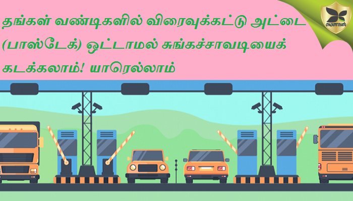 இதுவரை யாரெல்லாம் சுங்கக் கட்டணம் செலுத்தாமல் தங்கள் அடையாள அட்டையைக்காட்டி சுங்கச்சாவடியைக் கடந்து கொண்டிருந்தார்களோ அவர்கள் எல்லாம் தங்கள் வண்டிகளில் விரைவுக்கட்டு அட்டை (பாஸ்டேக்) ஒட்டத் தேவையில்லை. 29,கார்த்திகை,தமிழ்தொடர்ஆண்டு-5121: இதுவரை யாரெல்லாம் சுங்கக் கட்டணம் செலுத்தாமல், தங்கள் அடையாள அட்டையைக்காட்டி சுங்கச்சாவடியைக் கடந்து கொண்டிருந்தார்களோ, அவர்கள் எல்லாம் தங்கள் வண்டிகளில் விரைவுக்கட்டு அட்டை (பாஸ்டேக்) ஒட்டத் தேவையில்லை. விரைவுக்கட்டு அட்டை (பாஸ்டேக்) ஒட்டினால் எண்ணிம முறையில் இருந்து பணம் தானகப் பிடுங்கப்பட்டு விடுமே. அதனால் இதுவரை அந்தத் தகுதிக்கானவர்கள் தங்கள் வண்டியில் விரைவுக்கட்டு அட்டை (பாஸ்டேக்) ஒட்ட வேண்டாம். ஒன்றிய நெடுஞ்சாலைகள் மற்றும் மாநில நெடுஞ்சாலைகளில் வாகன ஓட்டிகள் சாலைகளை பயன்படுத்துவதற்காக சுங்க கட்டணம் வசூலிக்கப்படுகிறது. இதற்காக குறிப்பிட்ட தூர இடைவெளிகளில் சுங்கச் சாவடிகள் அமைக்கப்பட்டுள்ளன. எனினும், சுங்கச் சாவடிகளில் கட்டணம் செலுத்துவதில் இருந்து பலருக்கு விலக்கு அளிக்கப்படும் நடைமுறை இருந்து வருகிறது. குடியரசுத்தலைவர், துணைக்குடியரசுத்தலைவர், தலைமைஅமைச்சர், மாநில ஆளுநர்கள், தலைமை அறங்கூற்றுவர்கள், மக்களவைத் தலைவர், ஒன்றிய அமைச்சர்கள், மாநில முதல்வர்கள், உச்ச அறங்கூற்றுமன்ற அறங்கூற்றுவர்கள், மாநில அமைச்சர்கள், துணை நிலை ஆளுநர்கள், முப்படை தளபதிகள், சட்டப்பேரவை தலைவர், உயர் அறங்கூற்றுமன்ற தலைமை அறங்கூற்றுவர்கள் மற்றும் அறங்கூற்றுவர்கள், நாடாளுமன்ற உறுப்பினர்கள் ஆகியோருக்கு விலக்கு அளிக்கப்பட்டுள்ளது. மேலும், ராணுவ கமாண்டர், தலைமைச் செயலாளர்கள் (அந்தந்த மாநில எல்கைக்குள் மட்டும்), ஒன்றியத் துறைச் செயலாளர்கள், மக்களவை, சட்டமன்றச் செயலாளர்கள், இந்தியாவுக்கு வருகை தரும் வெளிநாட்டு தலைவர்கள். சட்டமன்ற மேலவை மற்றும் சட்டப்பேரவை உறுப்பினர்கள் (அந்தந்த மாநில எல்கைக்குள் மட்டும்), பரம் வீர் சக்ரா, அசோக் சக்ரா, மஹா வீர் சக்ரா, கீர்தி சக்ரா, வீர் சக்ரா விருது வென்றவர்கள் ஆகியோர் அடையாள அட்டையை காட்டிச் செல்லலாம். பாரா மிலிட்டரி படைகள், தீயணைப்பு மற்றும் சடுதிவண்டிகள், நெடுஞ்சாலைகள் ஆணைய பணி வாகனம், சடலங்களை எடுத்துச் செல்லும் வண்டிகள் ஆகியவற்றுக்கு விலக்கு உள்ளது. மேலும், மாற்றுத்திறனாளிகள் தங்களது வசதிக்கேற்ப வடிவமைக்கப்பட்ட வாகனங்களுக்கும் கட்டண விலக்கு உள்ளது. -தமிழர்க்குத் தொடர்ஆண்டு மட்டுமல்ல, தொடர் நாள் கணக்கும் உண்டு. இன்று தமிழ்த் தொடர்நாள் எண்:18,70,367.