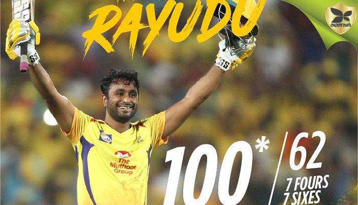 ஐபிஎல் டி 20 கிரிக்கெட் தொடரின் 11-வது சீசனின் 35-வது போட்டியில் சென்னை சூப்பர் கிங்ஸ் மற்றும் சன் ரைசர்ஸ் ஐதராபாத் அணிகள் புனே மைதானத்தில் பலப்பரீட்சை நடத்தின. இப்போட்டியில் டாஸ் வென்ற சென்னை அணி பந்து வீச்சை தேர்வு செய்தது. இதையடுத்து முதலில் களமிறங்கிய ஐதராபாத் அணி 20 ஓவர் முடிவில் 4 விக்கெட் இழப்பிற்கு 179 ரன்கள் சேர்த்தது. ஐதராபாத் அணி சார்பில் அதிகபட்சமாக ஷிகர் தவான் 79 ரன்களும், கேன் வில்லியம்சன் 51 ரன்களும் குவித்தனர். சென்னை தரப்பில் ஸ்ரதுல் தாகுர் 2 விக்கெட்டுகளையும் தீபக் சாகர் மற்றும் பிராவோ தலா ஒரு விக்கெட்டையும் வீழ்த்தினார். இதையடுத்து 180 ரன்கள் எடுத்தால் வெற்றி என்ற இலக்குடன் சென்னை சூப்பர் கிங்ஸ் அணி சார்பில் வாட்சன் மற்றும் அம்பதி ராயுடு ஆகியோர் தொடக்க வீரர்களாக களம் இறங்கினார்கள். இருவரும் ஐதராபாத் பந்து வீச்சை நாலாபுறமும் சிதறடித்தனர். சிறப்பாக விளையாடிய வாட்சன் 57 ரன்கள் எடுத்திருந்த போது ரன் அவுட் ஆனார். சென்னை சூப்பர் கிங்ஸ் அணி 13.3 ஓவரில் 134 ரன்கள் எடுத்தது குறிப்பிடத்தக்கது. அடுத்து வந்த ரெய்னா 2 ரன்னில் ஆட்டமிழக்க 3-வது விக்கெட்டுக்கு அம்பதி ராயுடு உடன் டோனி ஜோடி சேர்ந்தார். இருவரும் சென்னை அணியை வெற்றிப்பாதைக்கு அழைத்து சென்றனர். இறுதியாக சென்னை சூப்பர் கிங்ஸ் 19 ஓவரில் 2 விக்கெட் இழப்பிற்கு 180 ரன்கள் எடுத்து 8 விக்கெட் வித்தியாசத்தில் வெற்றி பெற்றது. அம்பதி ராயுடு 100 ரன்களுடனும், டோனி 20 ரன்களுடனும் இறுதிவரை ஆட்டமிழக்காமல் காலத்தில் இருந்தனர். இந்த வெற்றி மூலம் பிளேஆஃப் சுற்றை உறுதி செய்தது சென்னை சூப்பர் கிங்ஸ்.
