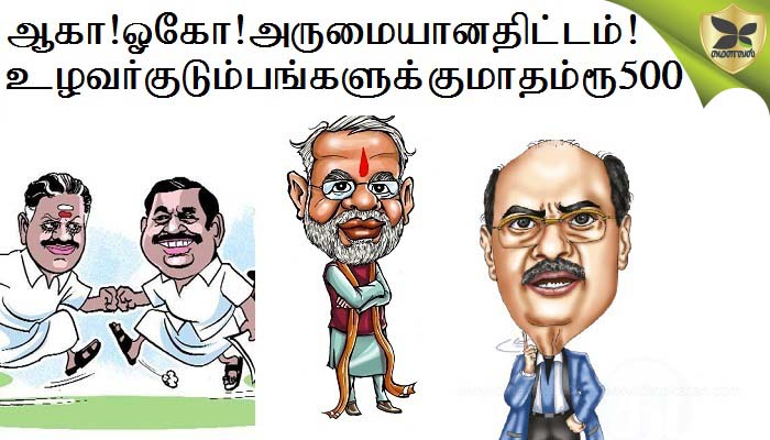 19,தை,தமிழ்தொடர்ஆண்டு-5120: நடுவண் அரசின் இடைக்கால வரவு-செலவுத் திட்டத்தை பாராட்டும் இரண்டே தலைவர்கள். 1.தமிழக முதல்வர் பழனிசாமி 2.பாமக நிறுவனர் இராமதாஸ் நடுவண் அரசின் இடைக்கால வரவு செலவுத் திட்டத்திற்;கு தமிழக முதல்வர் பழனிசாமி வரவேற்பு தெரிவித்துள்ளார். உழவர்களுக்கு ரூ.6,000 வழங்கும் திட்டம் வரவேற்கத்தக்கது என முதல்வர் கூறி மகிழ்ந்துள்ளார். இடைக்கால வரவு செலவுத் திட்டத்தில் வரவேற்கத்தக்க பற்பல அம்சங்களும் ஏமாற்றமளிக்கும் சிற்சில அம்சங்களும் உள்ளன என, பாமக நிறுவனர் ராமதாஸ் தெரிவித்துள்ளார். இதுதொடர்பாக ராமதாஸ் இன்று வெளியிட்ட அறிக்கையில்: மக்களவைத் தேர்தல் இன்னும் ஒரு மாதத்தில் அறிவிக்கப்படவுள்ள நிலையில், எதிர்பார்க்கப்பட்டவாறே பல சலுகைகள் நிதிநிலை அறிக்கையில் இடம் பெற்றுள்ளன. எனினும், வேலைவாய்ப்பையும், வளர்ச்சியையும் ஊக்குவிப்பதற்கான திட்டங்கள் அறிவிக்கப்படாதது பெரும் குறையாகவே உள்ளது. இந்தியாவில் சபிக்கப்பட்ட சமுதாயமாக உழவர்கள் இருப்பதால், அவர்களின் முன்னேற்றத்திற்கான திட்டங்களை செயல்படுத்த வேண்டும் என்று பாமக வலியுறுத்தி வந்தது. பாமகவின் நிழல் நிதிநிலை அறிக்கையிலும் உழவர்களுக்கு ஏக்கருக்கு ரூ.10,000 மூலதன மானியம் வழங்கும் திட்டத்தை செயல்படுத்த வேண்டும் என்று வலியுறுத்தப்பட்டிருந்தது. அதற்கு மதிப்பளிக்கும் வகையில், 5 ஏக்கருக்கும் குறைவான நிலம் வைத்துள்ள உழவர்களுக்கு ஆண்டுக்கு ரூ.6 ஆயிரம் (அதாவது மாதத்திற்கு ரூ500 மட்டும். தமிழக அரசு நீண்ட நெடுங்காலமாக முதியோர் உதவித் தொகையே மாதம் ஆயிரம் வழங்கி வருகிறது. என்பது மோடிக்குத் தெரியாமல் இருக்கலாம், பாமக நிறுவனருக்கு கூடவா தெரியாது) என்கிற இந்த வரவு-செலவுத் திட்டம் பாராட்டிற்குரியது. மொத்தத்தில் தேர்தலை நோக்கமாகக் கொண்டு தயாரிக்கப்பட்டுள்ள நிதிநிலை அறிக்கை வரவேற்கத்தக்க பல அம்சங்களையும், ஏமாற்றமளிக்கும் சில அம்சங்களையும் கொண்டுள்ளது என ராமதாஸ் தெரிவித்துள்ளார். -தமிழர்க்குத் தொடர்ஆண்டு மட்டுமல்ல தொடர் நாள் கணக்கும் உண்டு. இன்று தமிழ்த் தொடர்நாள் எண்: 18,70,050.