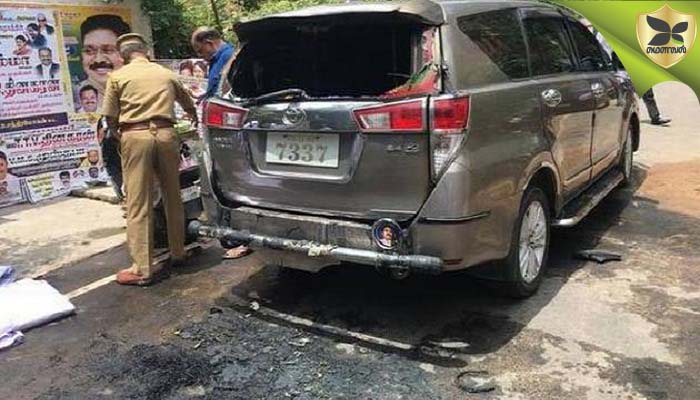 13,ஆடி,தமிழ்தொடர்ஆண்டு-5120:; இன்று காலை, அம்மா மக்கள் முன்னேற்ற கழக தலைவரும், இராகிநகர் சட்டமன்ற உறுப்பினருமான தினகரனின் கார் மீது அடையாளம் தெரியாத மர்ப நபர் பெட்ரோல் குண்டு வீசியுள்ளார். இச்சம்பவத்தின் போது தினகரன் காரில் இல்லாததால், அவருக்கு எந்த பாதிப்பும் ஏற்படவில்லை. பெட்ரோல் குண்டு வீசிய போது, ஓட்டுநர் காரை வேகமாக இயக்கி சென்றுள்ள நிலையில் காரின் சில பகுதி சேதமடைந்துள்ளதால், காரில் இருந்த ஓட்டுநர், தினகரனின் புகைப்படக்காரர் ஆகிய இருவருக்கும் காயம் ஏற்பட்டுள்ளதாக செய்திகள் வெளியாகியுள்ளன. இந்த அசம்பாவிதத்திற்கு தினகரன் கட்சியில் பணியாற்றிய முன்னாள் உறுப்பினர் புல்லட் பரிமளம் காரணமாக இருக்கக்கூடும் என சந்தேகிக்கப்படுகிறது. காவல்துறை விசாரணையில், தினகரன் கட்சியில் இருந்து அண்;மையில் நீக்கப்பட்ட புல்லட் பரிமளம் என்பவர் இன்னோவா காரில் வந்தார். அவரது காரில் இருந்த பெட்ரோல் குண்டு திடீரென வெடித்து தீ பரவியதாக கூறப்படுகிறது. இதில் தினகரன் ஆதரவாளர் பாண்டியன், புகைப்பட கலைஞர் டார்வின் காயமுற்றனர். தினகரன் வீடு மீது தாக்குதல் நடத்தும் நோக்கத்தில் பரிமளம் வந்ததாக தினகரன் தரப்பினர் கூறினர். இந்த சம்பவம் தொடர்பாக ஒருவர் கைது செய்யப்பட்டுள்ளார். -தமிழர்க்குத் தொடர்ஆண்டு மட்டுமல்ல தொடர் நாள் கணக்கும் உண்டு. இன்று தமிழ்தொடர்நாள் எண்: 18,69,863.