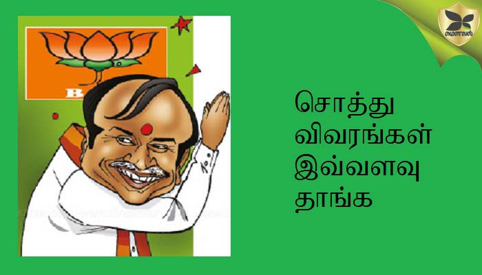 செயலலிதாவுக்கு மட்டுமே தமிழகத்தில் சொத்து இருந்ததைப் போல, அவர் மட்டுமே வாதம் வம்பு வழக்கு என்று சந்தித்து வந்த நிலை உலகறிந்த செய்தி. அதனுடன் ஒப்பிடும் போது ஒன்றும் குறைச்சல் இல்லாத வகையில்- நடைபெறவிருக்கும் நாடாளுமன்றத் தேர்தலில், வேட்பு மனு பதிகை செய்த சில பிரபலங்களின் சொத்து விவரங்கள் நம்மை மூக்கின் மீது விரல் வைக்க வைக்கிறது. அதுவும் அவர்களாக கணக்கு காட்டும் விவரம். தோண்டி துருவினால்? 12,பங்குனி,தமிழ்தொடர்ஆண்டு-5120: நாடாளுமன்றத் தேர்தலில் போட்டியிட வேட்பு மனு பதிகை செய்துள்ள வேட்பாளர்கள் தமிழிசை, எச்.ராஜா, கார்த்தி, கனிமொழி, தங்களது சொத்து விவரத்தை தெரிவித்துள்ளனர். அதன் விவரம்: தூத்துக்குடி, பாஜக வேட்பாளர், தமிழிசை சவுந்தரராஜன், நேற்று வேட்பு மனு பதிகை செய்தார். அவர் தனது சொத்து விவரமாக: கையிருப்பு- 50 ஆயிரம் ரூபாய், வங்கி சேமிப்பு- வைப்;பு, கார், நகை உட்பட மொத்தம், 1.05 கோடி ரூபாய், கணவர் சவுந்தரராஜன் பெயரில், வங்கி சேமிப்பு மற்றும் வைப்பு, 2.12 கோடி ரூபாய் இருப்பதாக தெரிவித்து உள்ளார். தன் பெயரில், 50 லட்சம் ரூபாய் மதிப்பிலான நிலமும், கணவர் பெயரில், 6.50 கோடி ரூபாய் மதிப்பிலான நிலம், உள்ளிட்ட அசையா சொத்துகள் இருப்பதாக, தெரிவித்து உள்ளார். சிவகங்கை தொகுதி, பாஜக வேட்பாளர், எச்.ராஜா, வேட்புமனுவுடன் அவர் பதிகை செய்துள்ள சொத்து மதிப்பு: கையிருப்பு- 75 ஆயிரம் ரூபாய், 2.40 லட்சம் ரூபாய் மதிப்பிலான, 10 சவரன் நகைகள் உட்பட, அசையும் சொத்துக்கள் மதிப்பு- 51 லட்சம் ரூபாய். அசையா சொத்துகள் மதிப்பு- 78 லட்சம் ரூபாய். மனைவி பெயரில் வங்கி இருப்பு- 50 ஆயிரம் ரூபாய், 14.40 லட்சம் ரூபாய் மதிப்பிலான, 60 சவரன் நகைகள் உட்பட, 19 லட்சம் ரூபாய்க்கு அசையும் சொத்துகள் உள்ளன. 94 லட்சம் ரூபாய்க்கு, அசையா சொத்துகள் உள்ளன. கூட்டு குடும்ப கணக்கில், வங்கி இருப்பு- 17 ஆயிரம் ரூபாய் உட்பட, அசையும் சொத்துகள், 1.57 கோடி ரூபாய்க்கு உள்ளது. அசையா சொத்துகள் மதிப்பு- 4 லட்சம் ரூபாய். மொத்தம், 3.52 கோடி ரூபாய்க்கு சொத்துகள் உள்ளன. கடன், 59 லட்சம் ரூபாய் உள்ளது. வழக்குகள்: திருமயத்தில் விநாயகர் ஊர்வலத்தில் காவல்துறையிடம் வாக்குவாதம் செய்ததாகவும், கடந்த நாடாளுமன்றத் தேர்தலில் காரைக்குடி, சிவகங்கையில் ஊர்வலமாகசென்றதாகவும் வழக்குகள் நிலுவையில் உள்ளன. சிவகங்கை காங்கிரஸ் வேட்பாளர் கார்த்தி, பெயரில் வங்கி கையிருப்பு ரூ.3 லட்சத்து 54 ஆயிரத்து 619.ரூ.1.22 லட்சம் மதிப்பிலான 40 கிராம் நகை, ரூ.90 ஆயிரம் மதிப்பில் 3 கேரட் வைரம். அசையும் சொத்துக்கள் மதிப்பு ரூ. 24 கோடியே 13 லட்சத்து 73 ஆயிரத்து 168.அசையா சொத்துக்கள் மதிப்பு ரூ.22 கோடியே 88 லட்சத்து 89 ஆயிரத்து 303. வழக்குகள்: இவர் மீது 2 ஜி ஸ்பெக்ட்ரம் ஊழல் தொடர்பான வழக்க