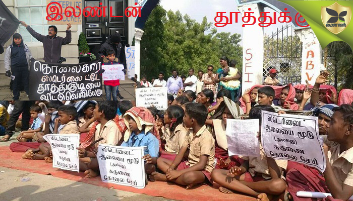 11,பங்குனி,தமிழ்தொடர்ஆண்டு-5119: தூத்துக்குடி தொழில் வளாகத்தில் ஸ்டெர்லைட் தாமிர உருக்காலை அமைந்துள்ளது. இந்த ஆலையால் சுற்றுச்சூழல் மாசுபடுவதாகவும் நிலத்தடி நீர் பாதிக்கப்பட்டுள்ளதாகவும் கூறி இந்த மாவட்ட மக்கள் மற்றும் மாணவர்கள் தொடர் போராட்டங்களில் ஈடுபட்டு வருகின்றனர். ஸ்டெர்லைட் ஆலையை விரிவாக்கம் செய்வதற்கு அப்பகுதி மக்கள் எதிர்ப்பு தெரிவித்து வருகின்றனர். சென்னை உயர்அறங்கூற்றுமன்ற மதுரைக் கிளை, நேற்று தூத்துக்குடியில் ஸ்டெர்லைட்டுக்கு எதிராக போராட்டம் நடத்த அனுமதியளித்து உத்தரவிட்டது. அறங்கூற்று மன்ற உத்தரவைத் தொடர்ந்து, ஸ்டெர்லைட் ஆலைக்கு எதிரான மக்கள் இயக்கத்தினர் மற்றும் வியாபாரிகள், பொதுமக்கள் நேற்று போராட்டத்தில் ஈடுபட்டனர். வியாபாரிகள் சங்கத்தின் சார்பில் 3 ஆயிரத்துக்கு மேற்பட்ட கடைகள் அடைக்கப்பட்டன. பகிர்வுத்தானிகள், சிறுபேருந்துகள் ஓடாததால் இயல்பு வாழ்க்கை பாதிக்கப்பட்டது. மாலையில் விவிடி.சிக்னல் அருகில் கண்டன ஆர்ப்பாட்டமும் நடைபெற்றது. இந்நிலையில், தூத்துக்குடி ஸ்டெர்லைட் தாமிர உருக்காலையை விரிவுபடுத்துவதற்கு எதிர்ப்பு தெரிவித்து லண்டனில் உள்ள உரிமையாளரின் வீட்டின் முன்னால் தமிழர்கள் போராட்டம் நடத்தினர். அப்போது அவர்கள் ஸ்டெர்லைட் ஆலையை விரிவுபடுத்த எதிர்ப்பு தெரிவித்து முழக்கங்கள் எழுப்பினர். மேலும் கண்டனச் செய்திகள் அடங்கிய பதாகைகளையும் வைத்திருந்தனர் என்பது குறிப்பிடத்தக்கது. -தமிழர்க்குத் தொடர்ஆண்டு மட்டுமல்ல தொடர் நாள் கணக்கும் உண்டு. இன்று தமிழ்தொடர்நாள் எண்: 18,69,737
