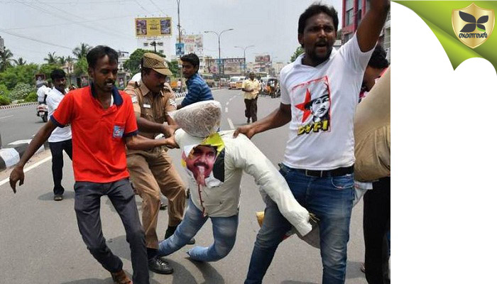 11,வைகாசி,தமிழ்தொடர்ஆண்டு-5119: தூத்துக்குடி துப்பாக்கிச் சூட்டைக் கண்டித்து, சேலத்தில் இந்திய ஜனநாயக வாலிபர் சங்கத்தைச் சேர்ந்தவர்கள் இன்று போராட்டத்தில் ஈடுபட்டனர். அப்போது மறைத்து வைத்திருந்த முதல்வர் எடப்பாடி பழனிசாமியின் உருவ பொம்மையை அவர்கள் எரிக்க முயன்றனர். அவர்களை காவல்துறையினர் தடுத்து நிறுத்தி முதல்வர் எடப்பாடி பழனிசாமியின் உருவ பொம்மையை போராட்டக்காரர்களிடமிருந்து மீட்டனர். சேதமடைந்த முதல்வர் எடப்பாடி பழனிசாமியின் உருவ பொம்மையை ஒழுங்கு படுத்தி எடுத்துச் சென்றனர். -தமிழர்க்குத் தொடர்ஆண்டு மட்டுமல்ல தொடர் நாள் கணக்கும் உண்டு. இன்று தமிழ்தொடர்நாள் எண்: 18,69,798.