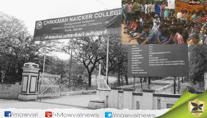 08,ஐப்பசி,தமிழ்தொடர்ஆண்டு-5119: ஈரோடு, வீரப்பன்சத்திரம் அருகே சிக்கய்ய நாயக்கர் கல்லூரி இயங்கி வருகிறது. இக்கல்லூரி கடந்த 19ஆண்டுகளாக அரசின் கட்டுப்பாட்டின்கீழ் இயங்கி வருகிறது. இக்கல்லூரியை அரசுக் கல்லூரியாக அறிவிக்கக் கோரி ஆசிரியர்கள், மாணவ, மாணவிகள் பலகட்ட போராட்டங்களைத் தொடர்ந்து நடத்தி வருகின்றனர். இந்நிலையில், இக்கல்லூரியை அரசுக் கல்லூரியாக மாற்ற நடவடிக்கை எடுக்கப்படும் என ஈரோட்டில் 22,ஆவணி,தமிழ்தொடர்ஆண்டு-5119 (07.09.2017) இல் நடைபெற்ற எம்ஜிஆர் நூற்றாண்டு விழாவின்போது முதல்வர் எடப்பாடி பழனிசாமி அறிவித்தார். ஆனால், இதுவரை அரசாணை வெளியிடப்படவில்லை. இந்நிலையில், இந்தக் கோரிக்கையை உடனடியாக நிறைவேற்ற வலியுறுத்தி சிக்கய்ய நாயக்கர் கல்லூரியின் முன்பு பல்கலைக்கழக ஆசிரியர் சங்கம் சார்பில் பேராசிரியர்கள் ஆர்ப்பாட்டத்தில் ஈடுபட்டனர். ஆர்ப்பாட்டத்துக்கு, அச்சங்க மாநில துணைத் தலைவர் பசுபதி தலைமை வகித்தார். முன்னாள் மாநிலத் தலைவர் செந்தாமரை, கிளைத் தலைவர் கமலக்கண்ணன் ஆகியோர் முன்னிலை வகித்தனர். இதில், கல்லூரி ஆசிரியர்கள், அலுவலகப் பணியாளர்கள் கலந்துகொண்டனர்