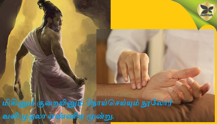 பொருள்: ஒருவருடைய உணவிலும் மற்றும் செயல்களிலும் அளவுக்கு மேல் காற்று, நீர், தீ கூடினாலும், குறைந்தாலும், அதுவே நோயாகும் என்பதாகும்.