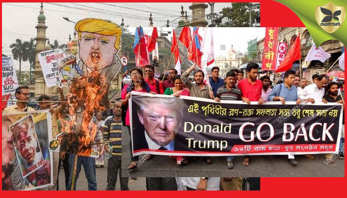 “திரும்பி போ டிரம்ப்” என ட்ரம்ப் பெயரைப் பதிவிட்டு பதாகைகள் ஏந்தி நாடு முழுவதும் பல்வேறு இடங்களில் நேற்று போராட்டங்கள் நடந்தன. டிரம்பின் இந்திய வருகையை விரும்பாதவர்கள் முன்னெடுத்தனர். 13,மாசி,தமிழ்தொடர்ஆண்டு-5121: அமெரிக்க அதிபர் ட்ரம்ப்பின் 2 நாள் இந்திய வருகை உலகளவில் கவனத்தை ஈர்த்துள்ளது. அமெரிக்க அதிபரின் இந்த 2 நாள் இந்தியப் பயணம் இரு நாடுகளிடையே பலனுள்ள சில வணிகத்தை உருவாக்கும் என கூறப்படுகிறது. ட்ரம்ப் இந்திய வருகையையொட்டி ‘வணக்கம் ட்ரம்ப்’ என்ற தலைப்பில் கூட்டம் ஒன்று குஜராத்தில் நேற்று சிறப்பாக முன்னெடுக்கப்பட்டது. இந்த கூட்டத்திற்காகக் குஜராத் அரசு ரூ. 100 கோடிக்கு மேல் செலவு செய்துள்ளது. இந்நிலையில் அமெரிக்காவையும் அதன் போக்கையும், அந்நாட்டு அதிபர்களையும் தொடர்ந்து விமர்சித்து வரும் கம்யூனிஸ்ட் அமைப்புகள் சிலவும் குடியுரிமைச் சட்டத் திருத்தத்திற்கு எதிராகப் போராட்டங்கள் நடத்தும் அமைப்புகள் சிலவும் ட்ரம்ப் இந்திய வருகையைக் கண்டித்து பல்வேறு மாநிலங்களில் நேற்று போராட்டம் நடத்தின. குறிப்பாக டெல்லி, கொல்கத்தா, ஹைதராபாத் உள்ளிட்ட பகுதிகளில் ட்ரம்ப் வருகைக்கு எதிராக நடத்திய ஆர்பாட்டங்களில் போராட்டக்காரர்களுக்கும் காவல்துறையினருக்கும் இடையே சண்டை ஏற்பட்டது. சில இடங்களில் இது வன்முறையாகவும் மாறியது.