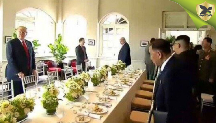 29,வைகாசி,தமிழ்தொடர்ஆண்டு-5120: சிங்கப்பூரில் அமெரிக்க அதிபர் டொனால்ட் ட்ரம்ப், வடகொரிய அதிபர் கிம் ஜாங்க் உன் இன்று சந்தித்து இரு நாட்டு உறவுகள் குறித்து பேச்சுவார்த்தை நடத்தினர். ட்ரம்ப் மற்றும் கிம் ஜாங் உன் ஆகியோரின் சந்திப்பு வரலாற்று தலையாயத்துவம் வாய்ந்ததாக பார்க்கப்படுகிறது. இந்த பேச்சுவார்த்தை சிங்கப்பூரின் செந்தோசா தீவில் உள்ள நட்சத்திர விடுதியில் இன்று காலை தொடங்கியது. முதலில் சுமார் 40 நிமிடங்கள் தலைவர்கள் மட்டத்திலும், பிறகு விரிவாகவும் பேச்சுவார்த்தைகள் நடந்தன. இந்த பேச்சுவார்த்தையில் இரு நாட்டு உயர் அதிகாரிகளும் பங்கேற்றனர். சிங்கப்பூர் அரசுதான் இந்த செலவீனங்களை பார்த்துக்கொள்கிறது. இந்த சந்திப்பால், சிங்கப்பூர் அரசுக்கு, சுமார் ரூ.101 கோடி செலவாகும் என கணக்கிடப்பட்டுள்ளது. இதனிடையே, இரு நாட்டு தலைவர்களுக்காக சிங்கப்பூர் அரசு, சுவை நிறைந்ததும் ஆடம்பரமானதுமாக, ஏற்பாடு செய்திருந்த மதிய உணவு சிங்கப்பூர் நேரப்படி காலை 11.30 மணிக்கு ட்ரம்ப்-கிம்ப் மற்றும் அதிகாரிகளுக்கு பரிமாறப்பட்டது. மதிய உணவு பட்டியலில், தொடக்கமாக பாரம்பரியமிக்க இரால் கோக்டெய்ல், அதனுடன் அவகடோ சலாட். பச்சை மாங்காய் கெரபு அதனுடன் ஹனி லைம் ட்ரெஸ்சிங் மற்றும் ஆக்டோபஸ். இது தவிர ஒரிசான் எனப்படும் கொரிய நாட்டின் புகழ்பெற்ற உணவுவகை ஒன்றும் பரிமாறப்பட்டது. வெள்ளரிக்காயுடன், மாட்டிறைச்சி, காளான், முட்டை உள்ளிட்டவை கலந்து தயாரிக்கப்படுவது இது. தொடர்ந்து பீப் ஷார்ட் ரிப் கான்பிட் எனப்படும் ஒயின் ஊற்றி செய்யப்படும் உணவு, அவிக்கப்பட்ட பிரக்கோலியுடன் உருளைக்கிழங்கு டாபினாய்ஸ், ரெட் வொயின் சாஸ், பன்றிக்கறியுடன் கூடிய யங்கோலி ப்ரைட் ரைஸ், சில்லி சாஸ், சிலவகை மீன் மற்றும் காய்கறிகள். இனிப்பு வகைகள். சாப்பாட்டுக்கு பிந்தைய டார்க் சாக்லேட் டார்ட்லெட் கனாசே, வென்னிலா ஐஸ்க்ரீம் மற்றும் செர்ரி கவுலிஸ் மற்றும் டிராபிஜின்னே. என்று சிங்கப்பூர் விருந்தோம்பல் இருநாட்டு தலைவர்களை மகிழ்விப்பதாயும் சிங்கப்பூருக்கு பெருமை சேர்ப்பதாயும் அமைந்தது. -தமிழர்க்குத் தொடர்ஆண்டு மட்டுமல்ல தொடர் நாள் கணக்கும் உண்டு. இன்று தமிழ்தொடர்நாள் எண்: 18,69,816.