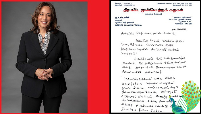 கமலா ஹாரிசின் தமிழகத் தொடர்பினை நினைவூட்டும் வகையில் நம் தாய்மொழியாம் தமிழில் வாழ்த்து மடல் எழுதி அனுப்பி உள்ளதாகக் குறிப்பிட்டு மு.க.ஸ்டாலின் வாழ்த்து. 23,ஐப்பசி,தமிழ்த்தொடராண்டு-5122: அமெரிக்கத் துணை அதிபராகத் தேர்வு செய்யப்பட்டுள்ள இந்திய எச்சமும், தமிழகத்தைப் பூர்விகமாகக் கொண்டவருமான, கமலா ஹாரிசுக்கு, திமுக தலைவர் மு.க.ஸ்டாலின் தமிழில் வாழ்த்துக் கடிதம் அனுப்பியுள்ளார். தமிழகத்தின் திருவாரூர் மாவட்டம், துளசேந்திரபுரம் கிராமத்தைப் பூர்வீகமாகக் கொண்ட கமலா ஹாரிஸ், அமெரிக்க நாட்டின் துணை அதிபராக தேர்வு செய்யப்பட்டுள்ளார். இதனால், அவருக்கு உலகம் முழுவதும் இருந்து பாராட்டுக்கள் குவிந்த வண்ணம் உள்ளன. இந்த நிலையில், அமெரிக்கத் துணை அதிபராகத் தேர்வு செய்யப்பட்டுள்ள கமலா ஹாரிசுக்கு, திமுக தலைவர் மு.க.ஸ்டாலின், தனது கைப்படத் தமிழில் வாழ்த்துக் கடிதம் ஒன்றை எழுதி அனுப்பியுள்ளார். அதில், அமெரிக்காவின் முதல் பெண் துணை அதிபர் கமலா ஹாரிஸ் என்பதாலும், அவர் நமது தமிழகத்தைச் சேர்ந்த பெண்மணி என்பதும், தமிழக மக்கள் அனைவருக்கும் பெருமிதம் கொள்ள வைக்கும் இனிய செய்தி என்றும், ஒரு தமிழ்ப் பெண், அமெரிக்காவையும் ஆளத் தகுதி படைத்தவர் என்பதை, உங்களது கடின உழைப்பு மெய்ப்பித்துள்ளது என்றும் தெரிவித்துள்ளார். மேலும், கமலா ஹாரிஸின் தமிழகத் தொடர்பினை நினைவூட்டும் வகையில் நம் தாய்மொழியாம் தமிழில் வாழ்த்து மடல் எழுதி அனுப்பி உள்ளதாகவும் மு.க.ஸ்டாலின் குறிப்பிட்டுள்ளார்.