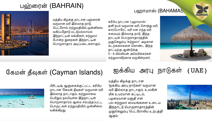 அரபு நாடுகளிலிருந்து பெட்ரோல் இறக்குமதி செய்து, நடுவண் அரசு மேற்கொள்ளும் பெட்ரோல் வணிகத்தில், பெட்ரோல் உற்பத்தி நாடுகளை விடவும், சந்தைப்படுத்தும் வணிக நிறுவனங்களை விடவும், இந்திய அரசுக்கு இரட்டிப்பு ஆதாயம் இருப்பதை புள்ளி விவரங்கள் காட்டுகின்றன. எனவே இந்தியாவும் கீழ்காணும் வருமான வரியில்லாத நாடுகளின் பட்டியலில் இடம் பெறுவது சாத்தியமே. 02,பங்குனி,தமிழ்தொடர்ஆண்டு-5121: உலகில் ஒவ்வொரு நாடும் வருமானம் மிகுதியாக வருகிற தொழிலை தன் கைவசமே வைத்துள்ளன. அதனால் வரி வாங்கி நாட்டை நிருவகிக்க வேண்டிய கட்டாயம் உலகில் எந்த நாட்டிற்கும் இல்லை. வேலை செய்யும் மக்களிடம் இருந்தும், தொழில் செய்யும் நிறுவனங்களிடமிருந்தும் வருமான வரி வாங்குவது அந்த நாட்டின் நிருவாக பொறுப்பின்மையையே காட்டுவதாகும். உலகில் பல நாடுகள் குறைவான வருமான வரி வாங்குதல். ஒரு சில நாடுகளில் வருமான வரி கட்ட வேண்டிய தேவையே இல்லை என்பதான குறைவான பொறுப்பு மற்றும் நிறைவான பொறுப்பான நிருவாகம் அந்த நாடுகளில் முன்னெடுக்கப்படுகிறது. நாட்டு மக்களிடம் வருமான வரி வசூலிக்காமல், வருமான வரி இல்லாத நாடுகளை பற்றி பார்ப்போம். 1. பஹாமாஸ் அழகை கொட்டிவைத்திருக்கும் மனதை கொள்ளைகொள்ளும் அழகிய கடற்கரைகள் மற்றும் வேகமாக வளர்ந்து வரும் பொருளாதாரத்துடன் இருப்பதால் அரசு மக்களிடம் வருமான வரி வசூலிப்பதில்லை. பஹாமாஸ் வருமான வரி இல்லாத மிகவும் வாழக்கூடிய நாடுகளில் ஒன்றாகும். இப்போது நாமும் முதலீடு செய்து அங்கு குடியேறலாம். பஹாமாஸ் இல் முதலீடுகளை செய்யாமல் தற்காலிக அனுமதியைப் பயன்படுத்தும் வெளிநாட்டவர்கள் மீது நடவடிக்கை எடுக்கத் தொடங்கியுள்ளது. நீங்கள் நீண்ட காலம் அங்கேயே தங்க விரும்பினால் நிரந்தர வசிப்பிடத்திற்கான தொகையாக குறைந்தபட்சம் 250,000 டாலர் அதாவது இன்றைய இந்திய ரூபாய் மதிப்பில் 1,77,50,000 ரூபாய்க்கு சொத்தை வாங்க வேண்டும். 2. பஹ்ரைன் மேலும் வருமான வரி இல்லாத ஒரு சில நாடுகளில் இதுவும் ஒன்றாகும். இங்கு நகரங்கள் மிகவும் வளர்ச்சி பெற்றுள்ளது. வெளிநாட்டினர்களும் இங்கு வசித்து வருகிறார்கள். பஹ்ரைனில் நீங்கள் நிரந்தர வசிப்பிடத்தை பெறுவது சாத்தியம் என்றாலும், குடியுரிமை பெறுவது மிக கடினம். நீங்கள் தொடர்ந்து 25 ஆண்டுகள் அந்த நாட்டில் வாழ வேண்டும், அரபு மொழியில் சரளமாக பேசத் தெரிந்திருக்க வேண்டும். இன்னும் பல விதிமுறைகள் உள்ளன. இங்கு நிரந்தர வசிப்பிடத்தை வெளிநாட்டினர் பெற 135,000 அமெரிக்கா டாலர்களை அதாவது 94,50,000 ரூபாயை செலுத்த வேண்டுமாம் அல்லது பக்ரைன் கம்பெனியில் 270,000 அமெரிக்கா டாலர்களை அல்லது 1,89,00,000 ரூபாயை நீங்கள் முதலீடு செய்திருக்க வேண்டும் 3. புருனே 4. கெய்மன் தீவுகள