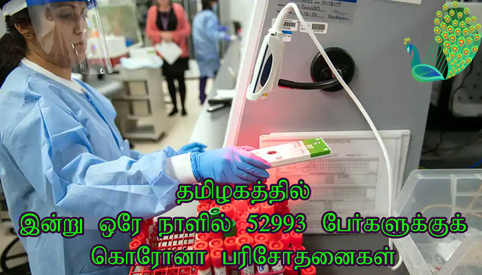 தமிழகத்தில் இன்று ஒரே நாளில் 52993 பேர்களுக்குக் கொரோனா பரிசோதனைகள் மேற்கொள்ளப்பட்டன.