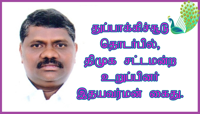 துப்பாக்கிச்சூடு தொடர்பில் கைது செய்யப்பட்டுள்ள திருப்போரூர் தொகுதி திமுக சட்டமன்ற உறுப்பினர் இதயவர்மனை 15 நாட்கள் அறங்கூற்றுமன்றக் காவலில் வைக்க செங்கல்பட்டு அறங்கூற்றுமன்றம் உத்தரவிட்டுள்ளது.