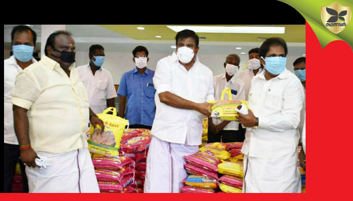 திருச்சி மேற்கு தொகுதிக்குட்பட்ட 34 வார்டுக்கு தலா 250 அரிசி மூட்டைகள் வீதம் தி.மு.க பகுதி செயலாளர்கள் மற்றும் வட்ட பிரதிநிதிகளிடம் தி.மு.க முதன்மை செயலாளர் கே.என்.நேரு வழங்கினார்.