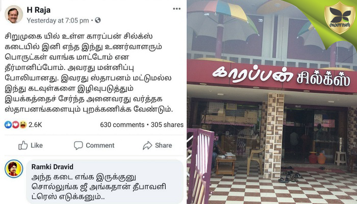 எச்.இராஜாவும், ஹிந்துத்வ அமைப்புகளும் செய்த விளம்பரத்தால் சிறுமுகையில் விற்பனை அதிகரித்துள்ளதாக காரப்பன் சில்க்ஸ் நிறுவனர் காரப்பன் மகிழ்ச்சியைக் கொண்டாடுகிறார்.